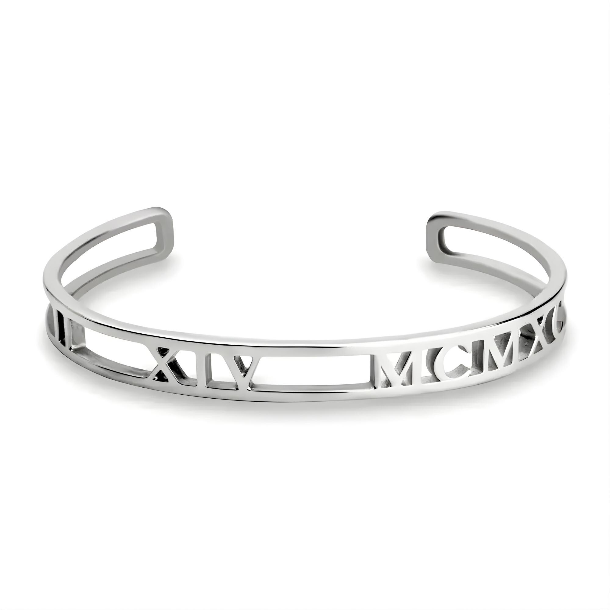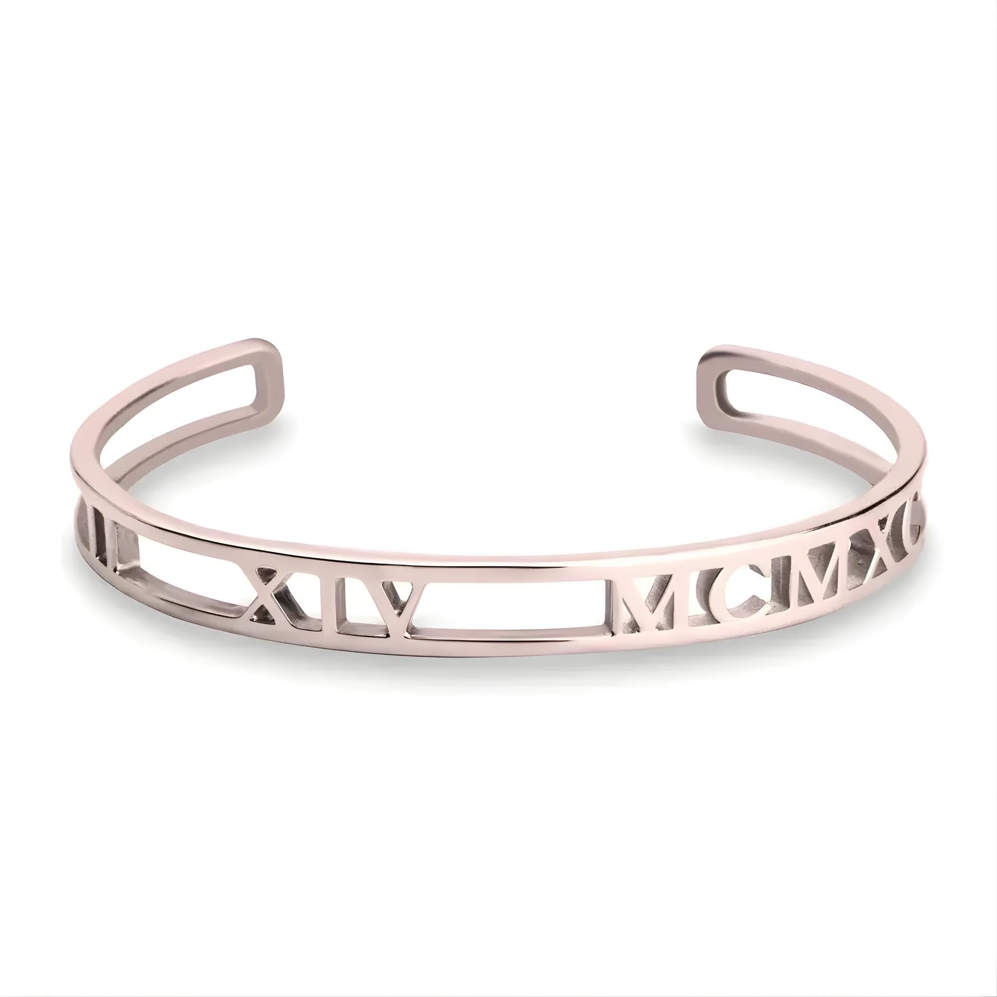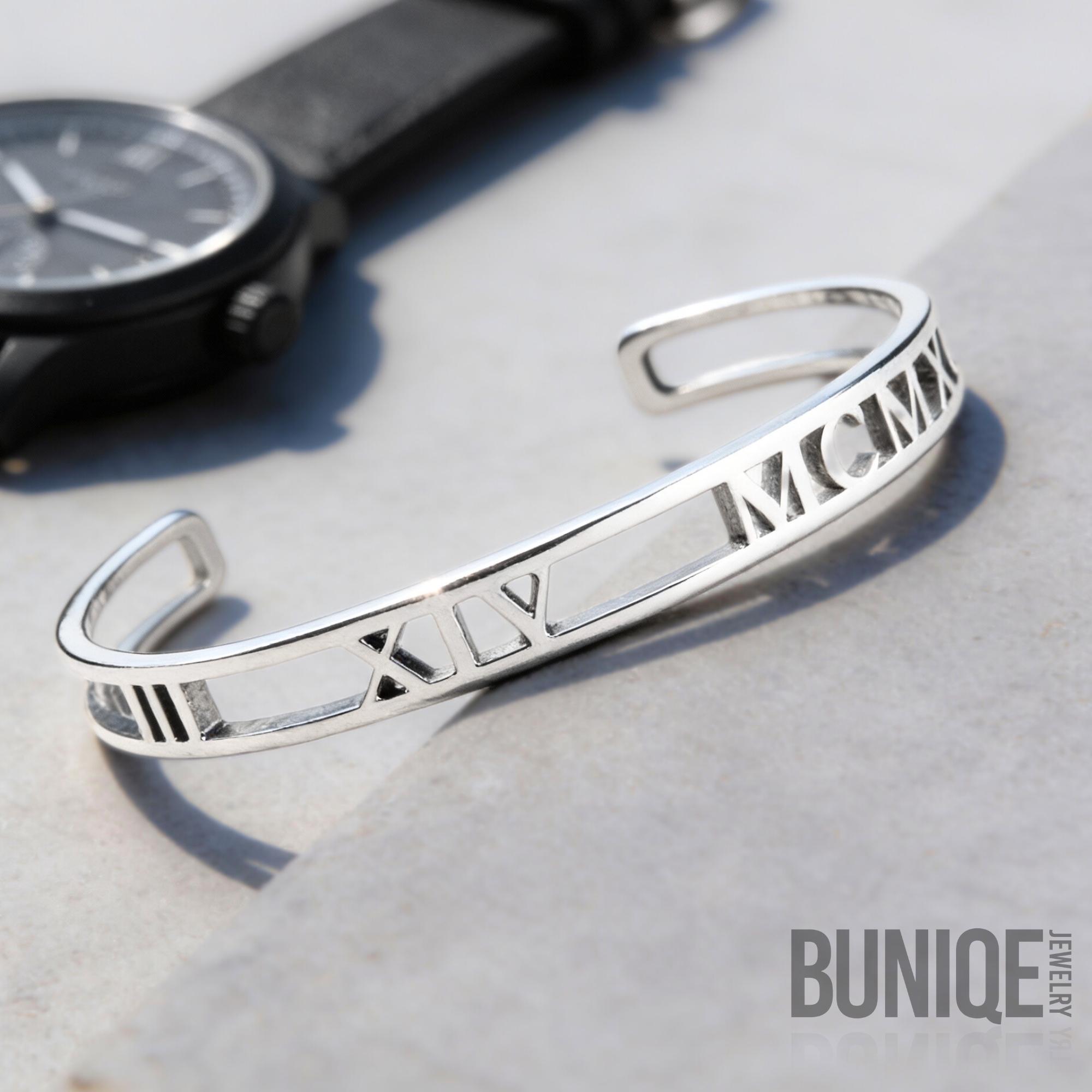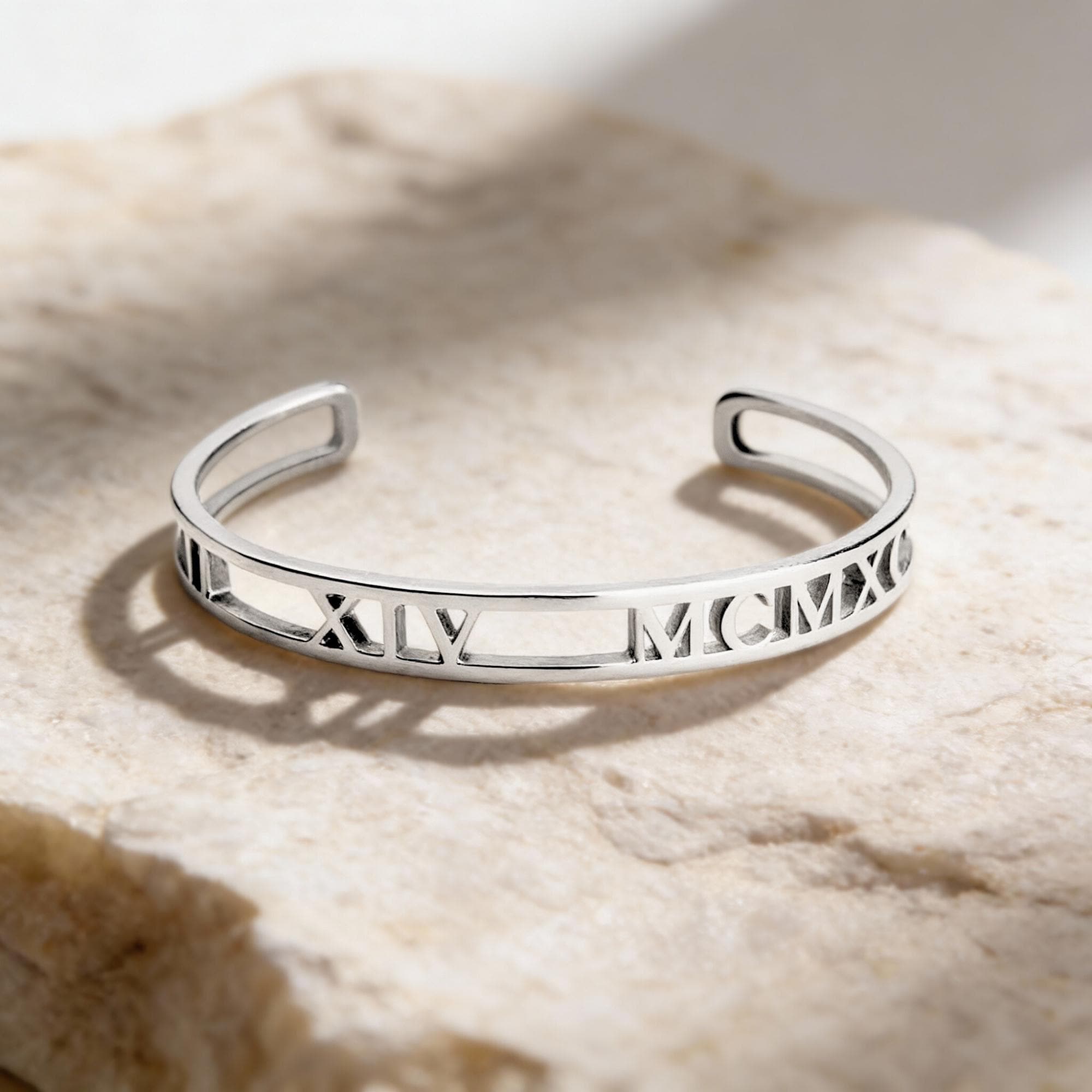 Featuring your custom date engraved in timeless Roman numerals, this unisex open cuff bracelet is a modern, meaningful piece made to last.