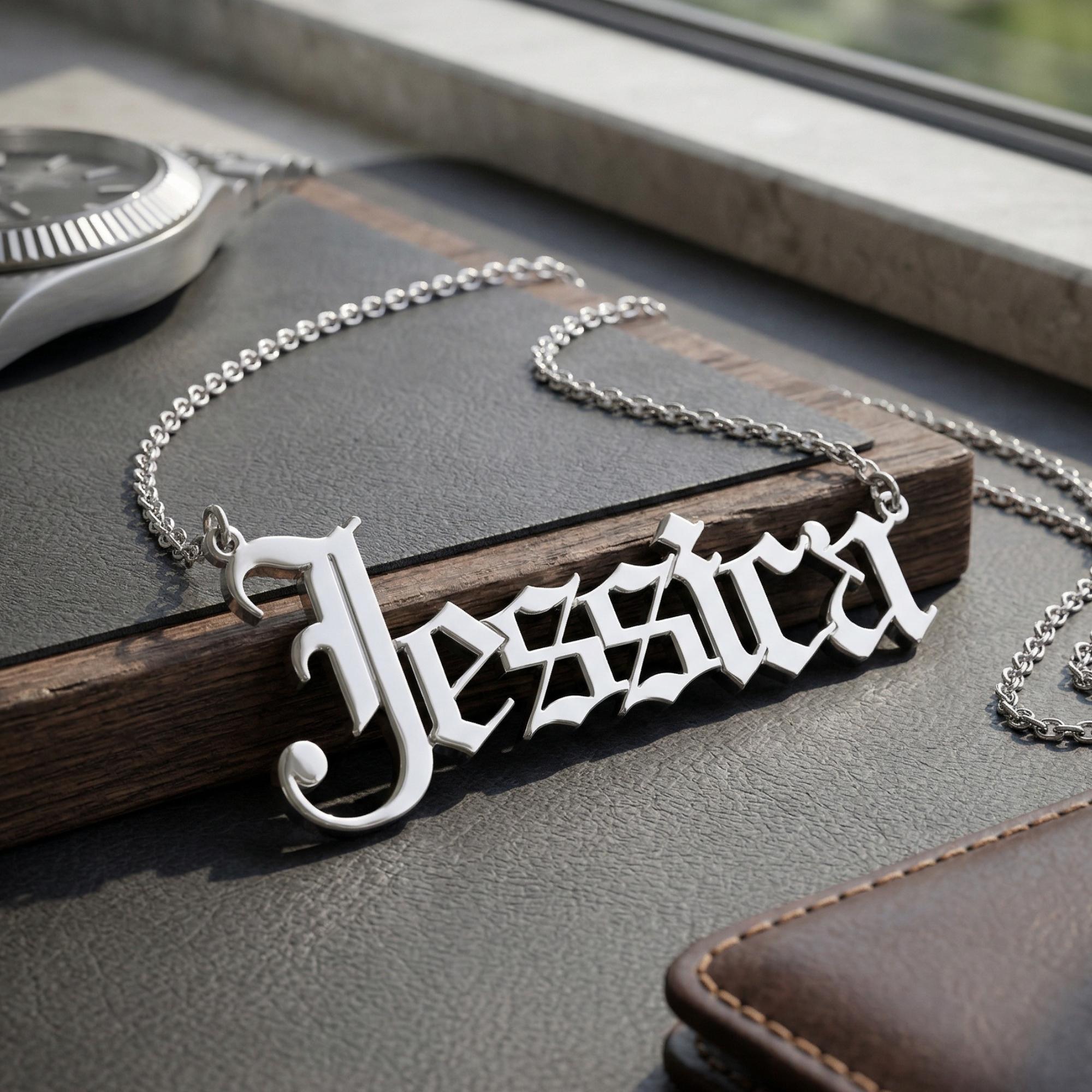 A custom-designed, bold letters, gothic font nameplate with a 3mm silver Rolo chain to complete the look, only for you!