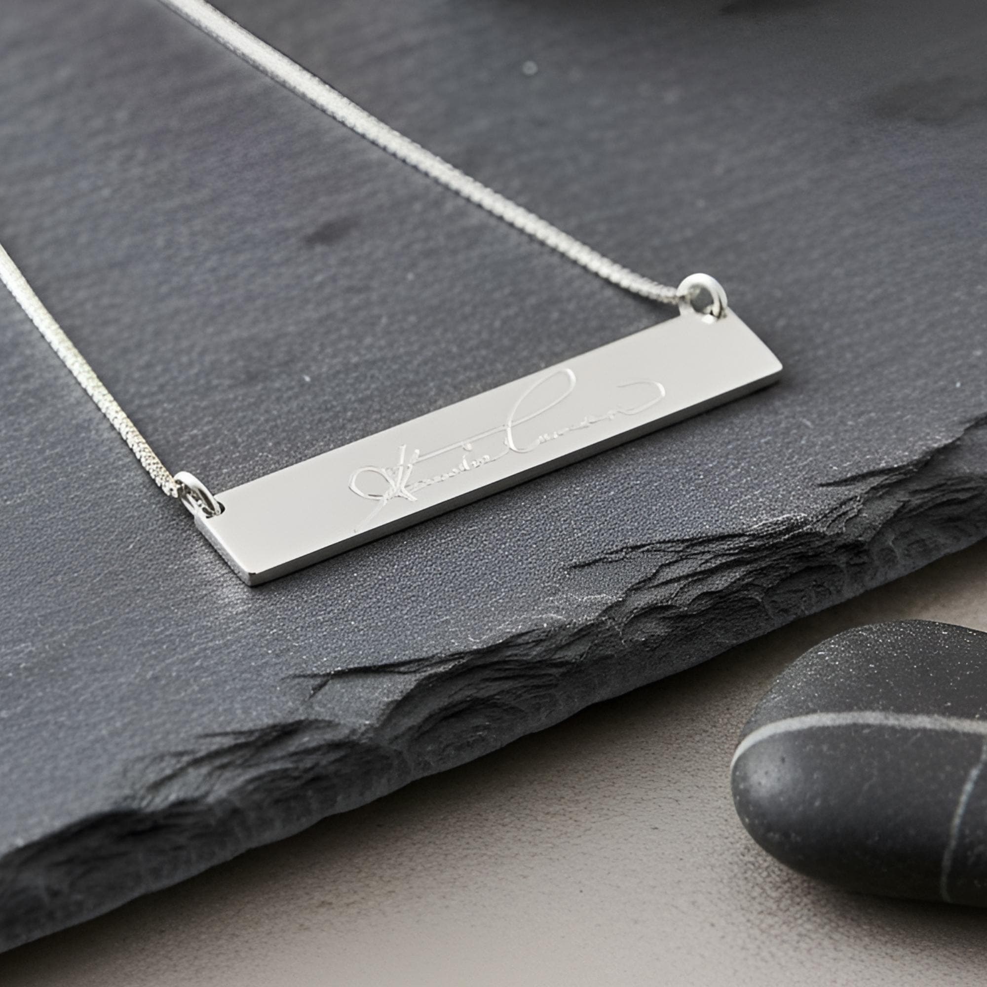 Horizontal Bar Necklace – Sterling Silver Personalized Roman Numerals, Name, Signature, Numbers, Dates, Secret Message!