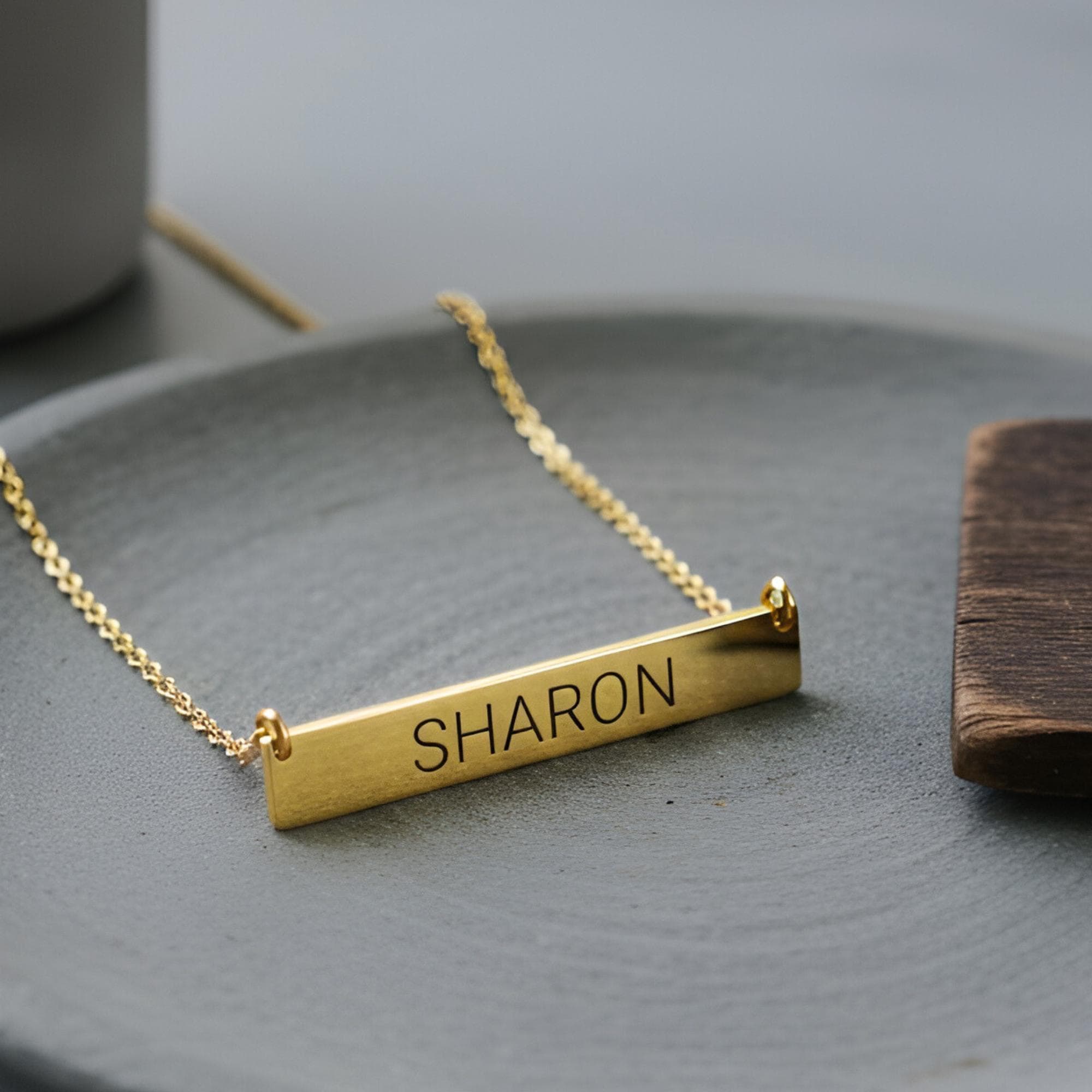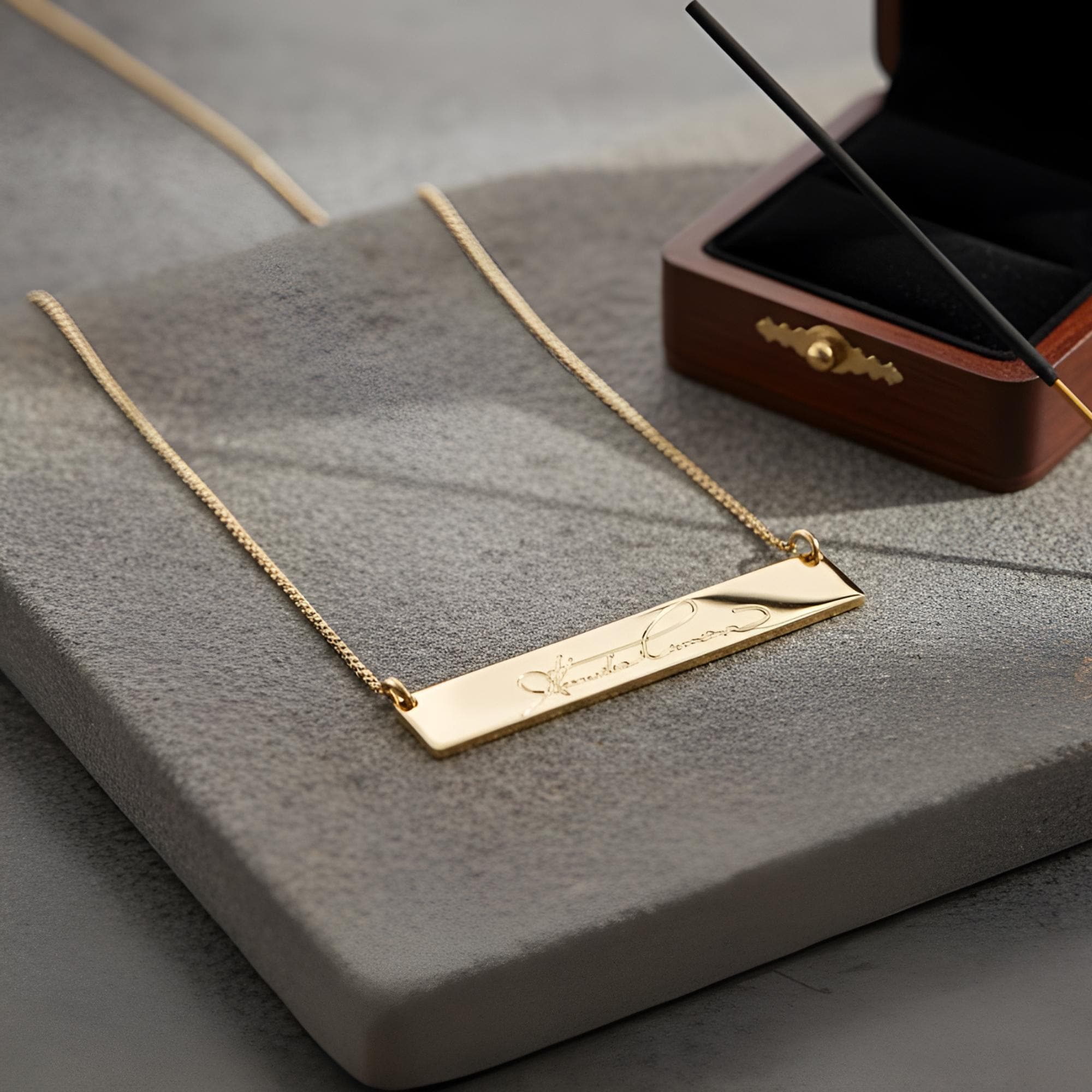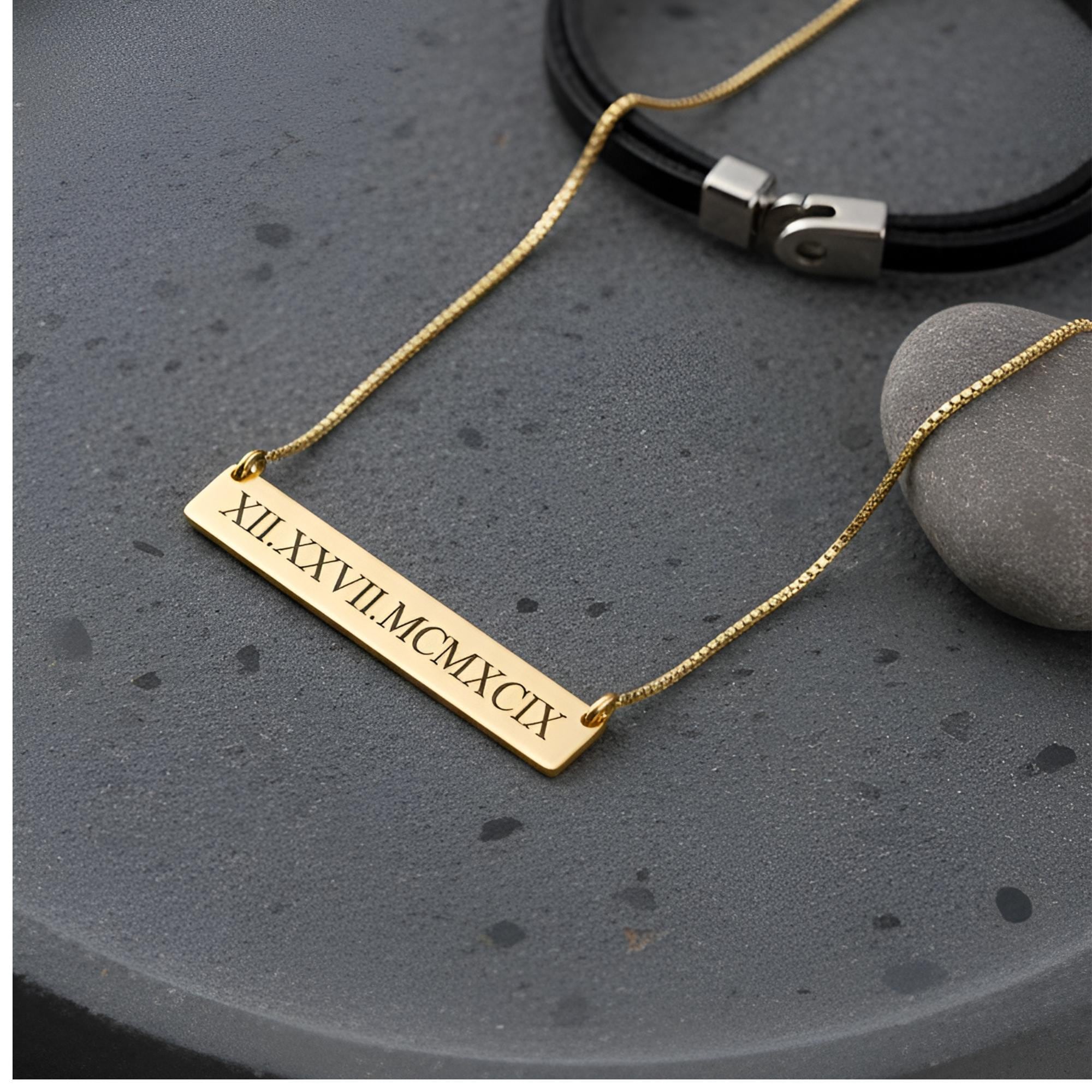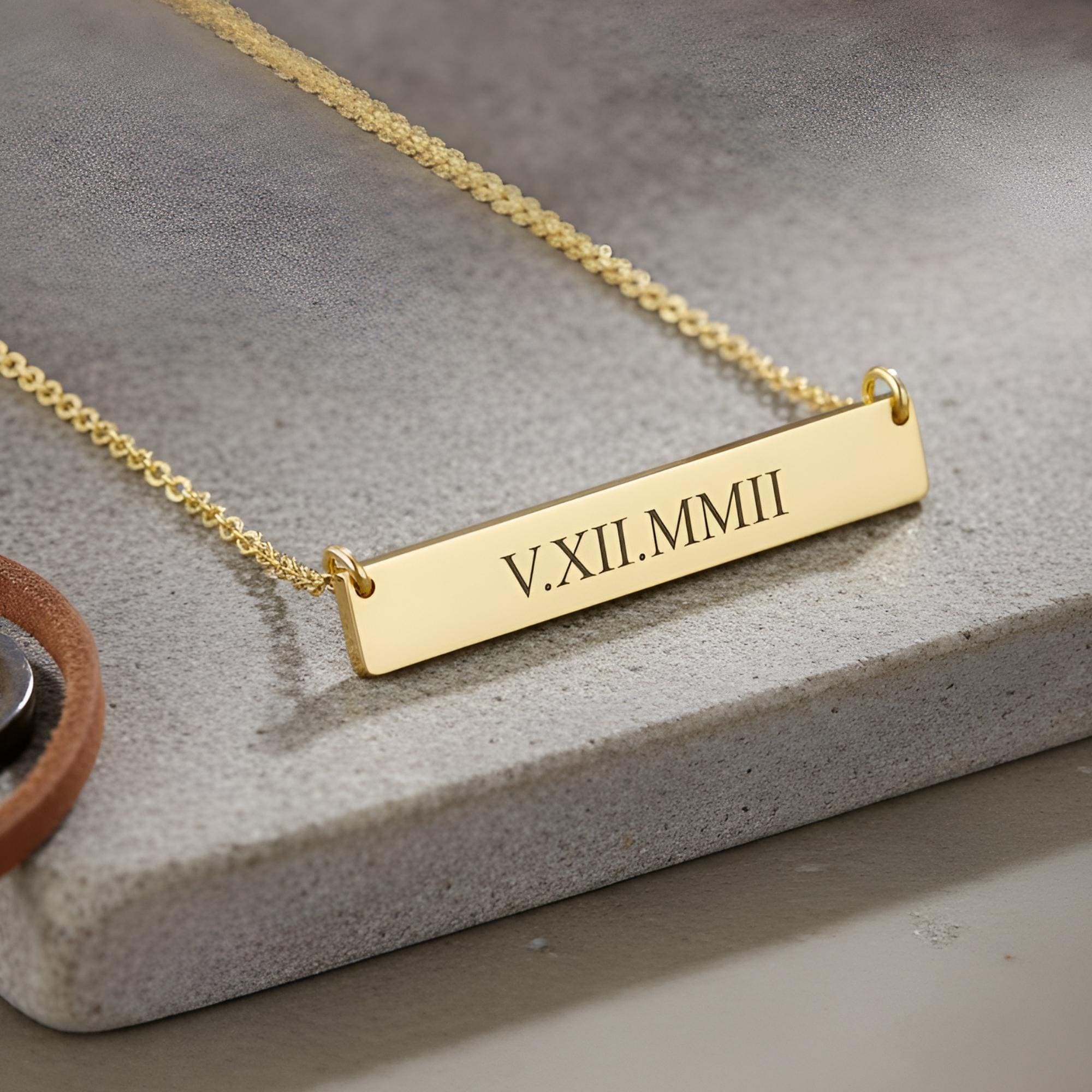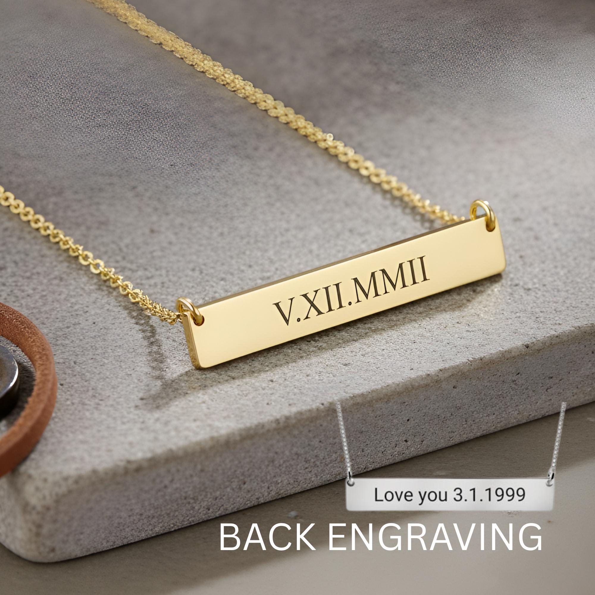 This bar necklace combines timeless elegance with personal meaning, offering a beautiful way to keep important dates, initials, or names close to the heart.