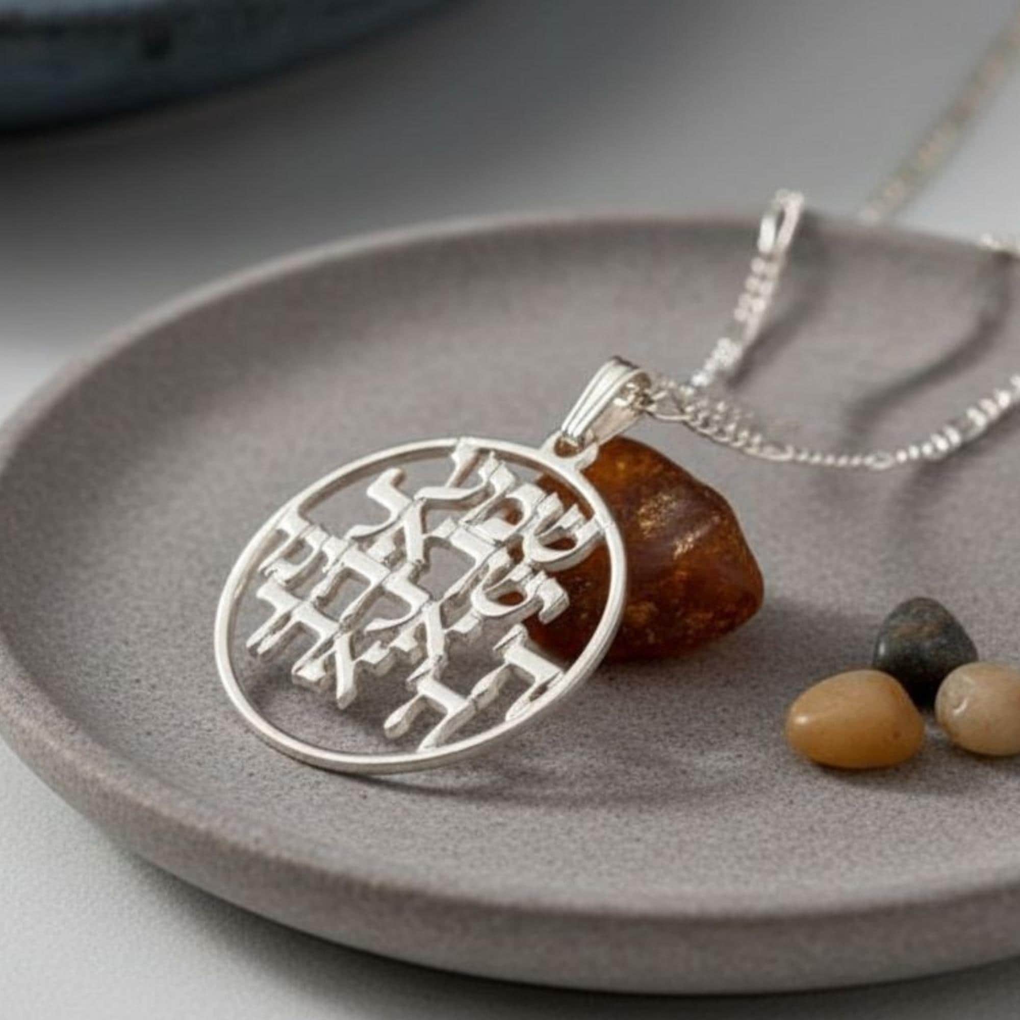 It features a solid silver round pendant with cut-out Hebrew letters, forming your chosen Bible verse in a circular frame.
