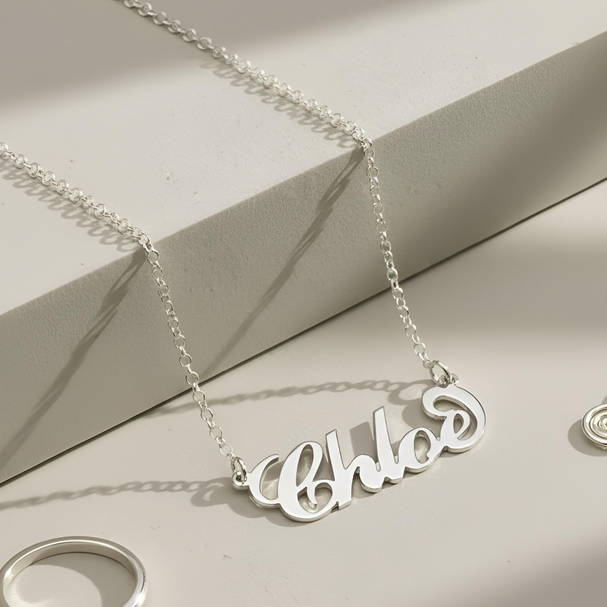 Perfect for any occasion, this nameplate necklace is beautifully crafted from solid sterling silver to match your style and preferences, whether you want a delicate, classic, or bold statement name pendant.
