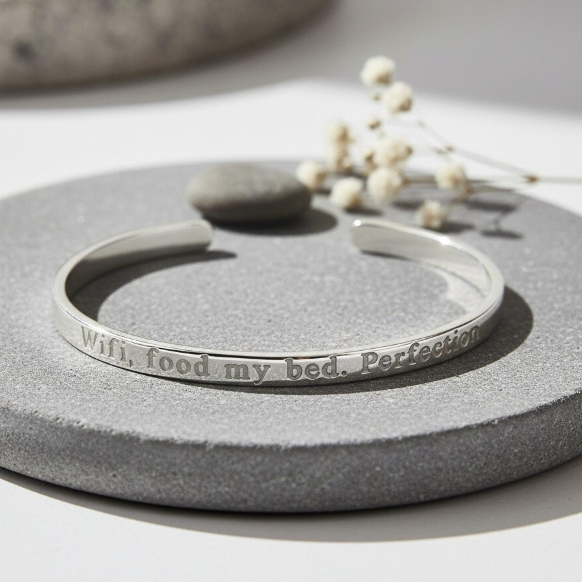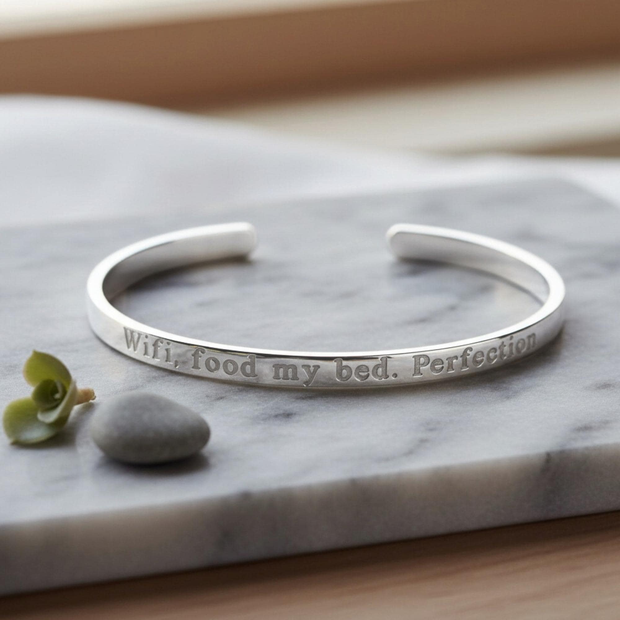 This open bangle is fully adjustable and can be customized with a meaningful engraving.