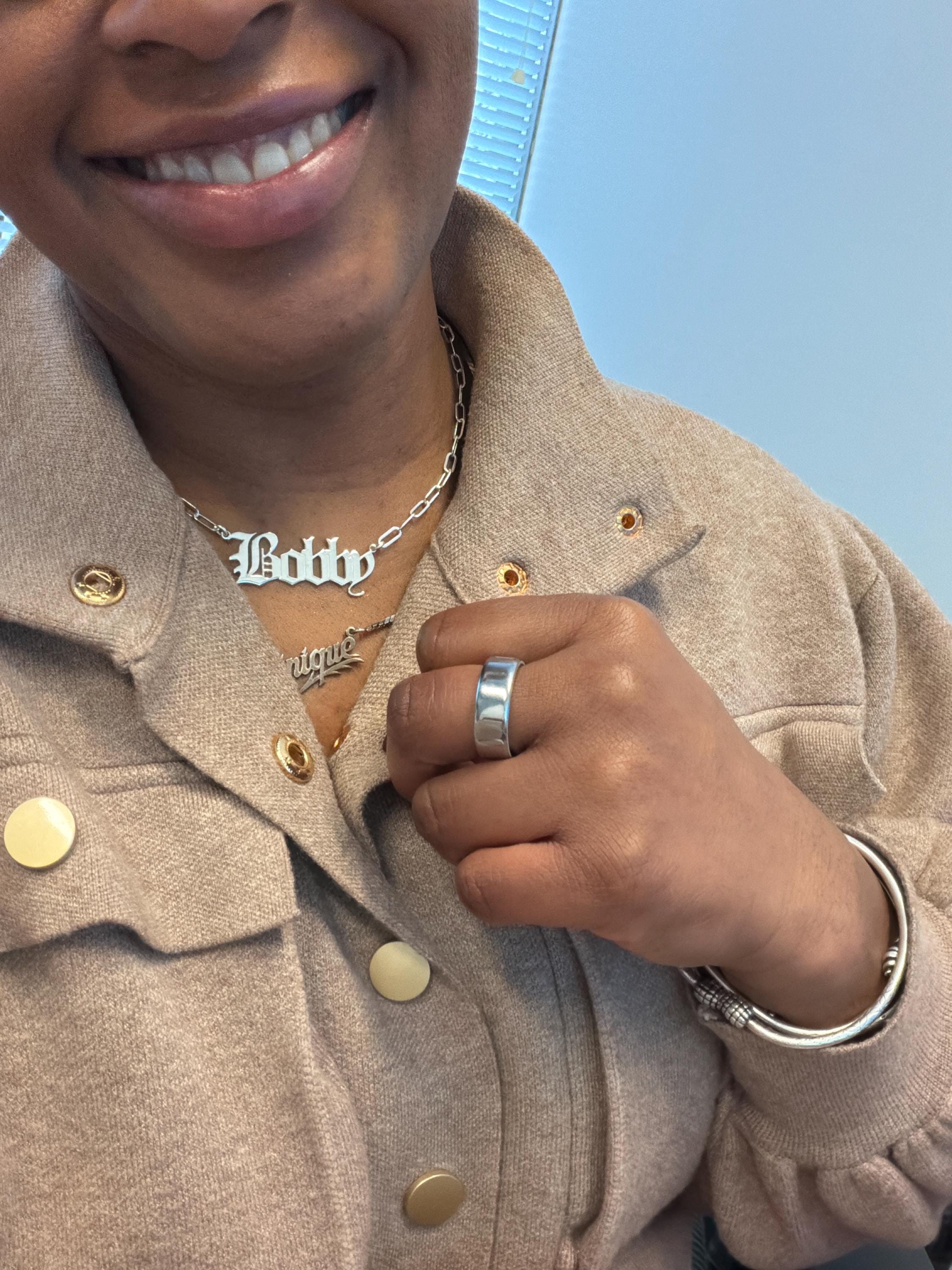 • Personalized Name: Custom name pendant in Old English font.