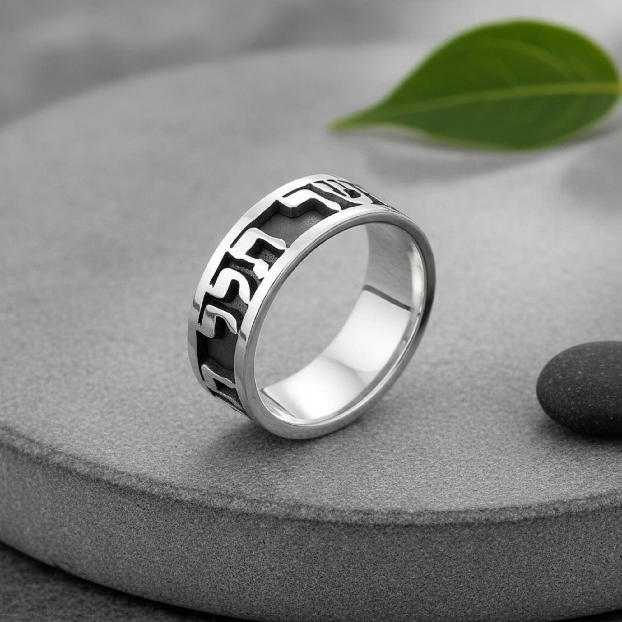 The band features a two‑tone design: a rich, oxidized sterling silver inner band provides a deep contrast to the polished outer Hebrew letters.