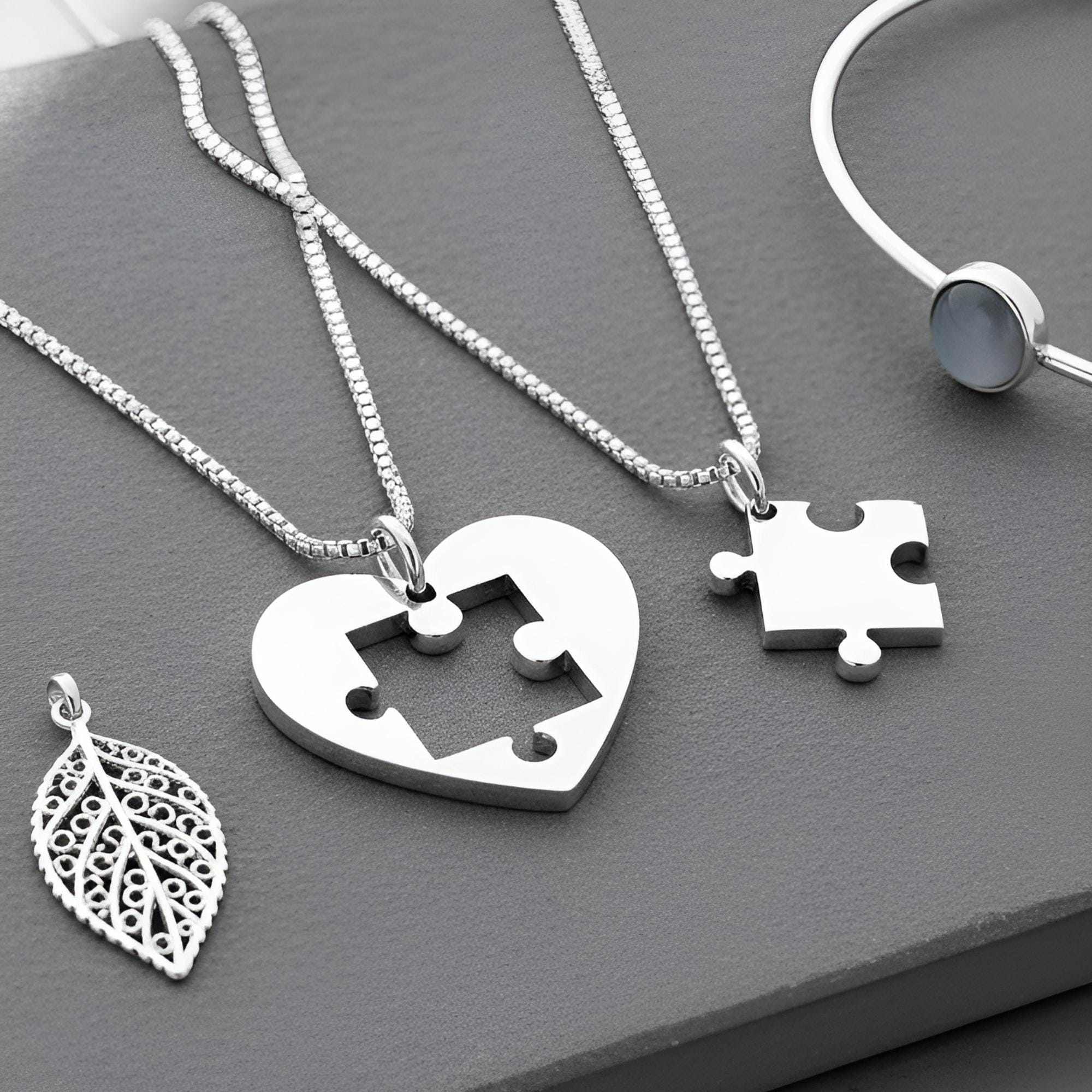 Your heart puzzle necklace set will arrive in an elegant gift box, ready for gifting!