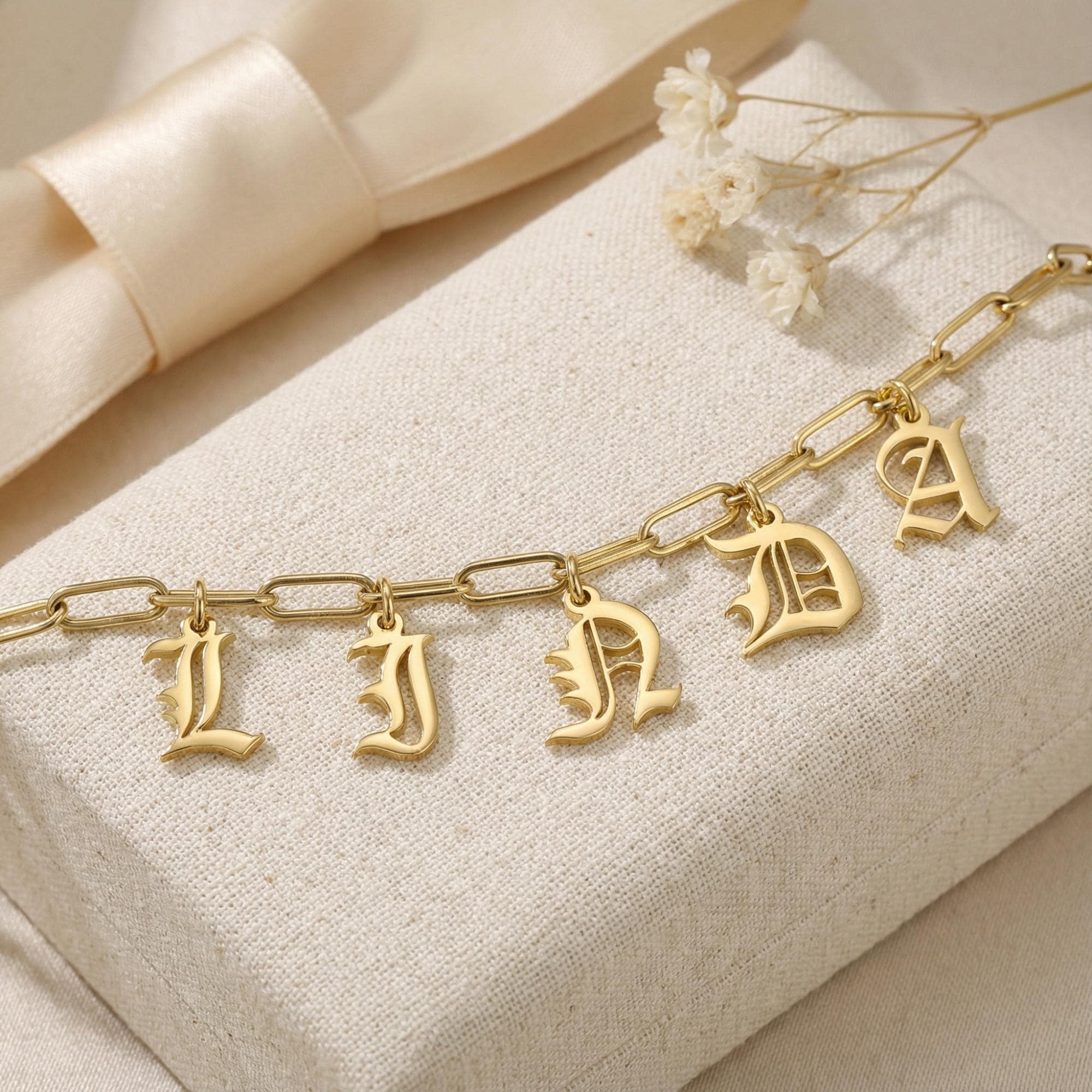 This elegant Paperclip Chain Necklace features a customizable Old English initial charm for each child. Handmade with love, it is crafted from 925 Sterling Silver or 24K Gold Plated, blending timeless style and personal sentiment to gift your loved mom.