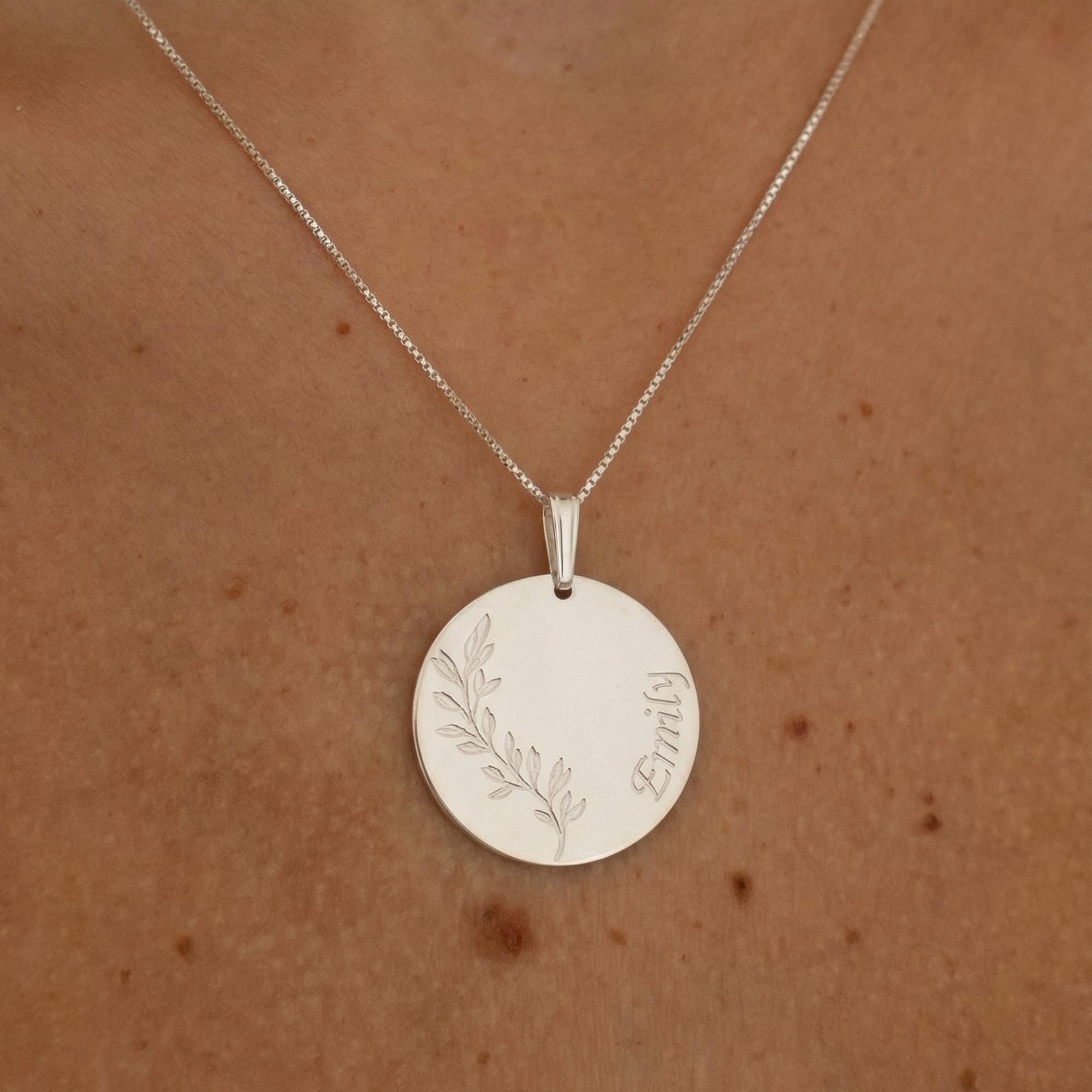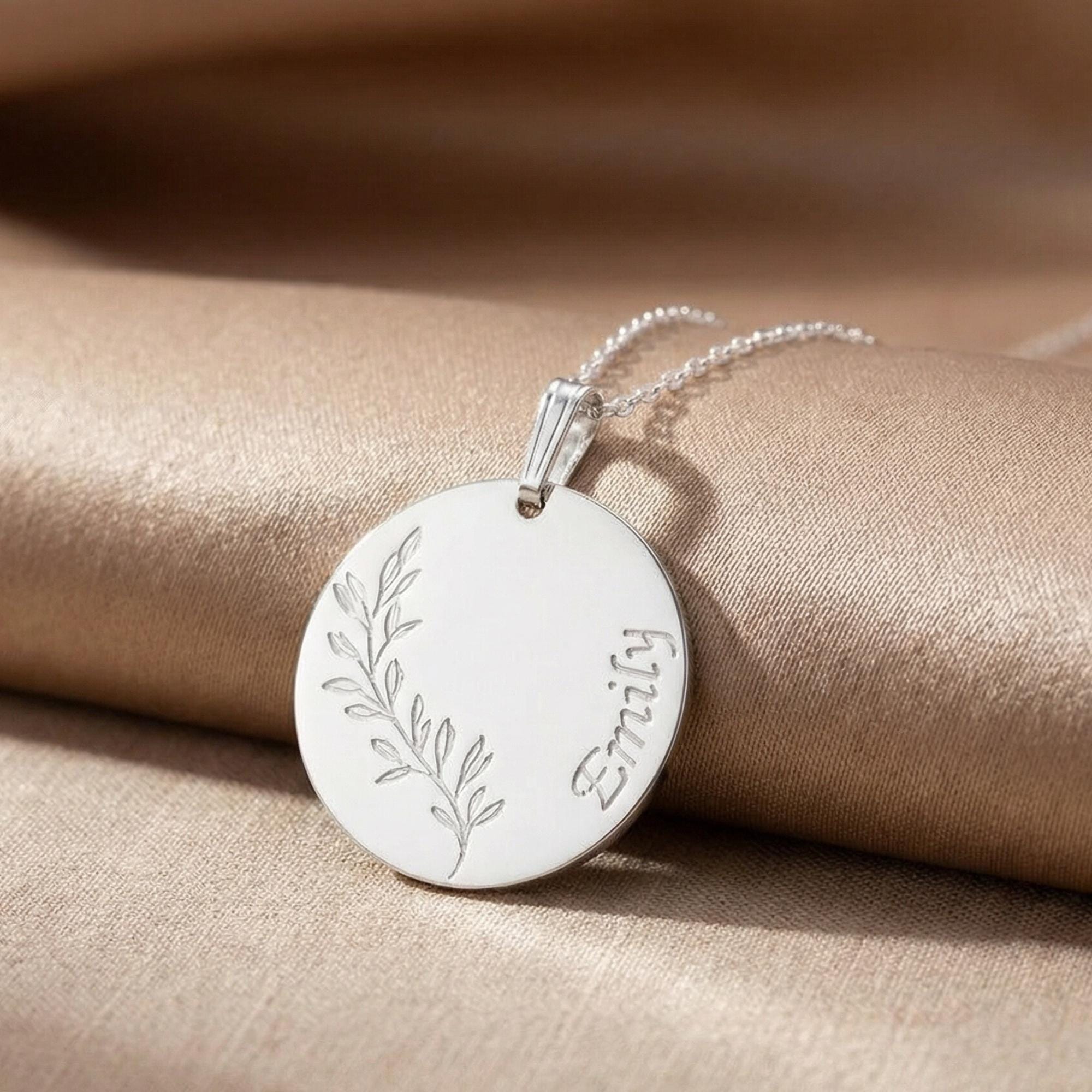 💎 A delicate personalized leaf name necklace featuring a round engraved disc with your custom name and a graceful botanical design.