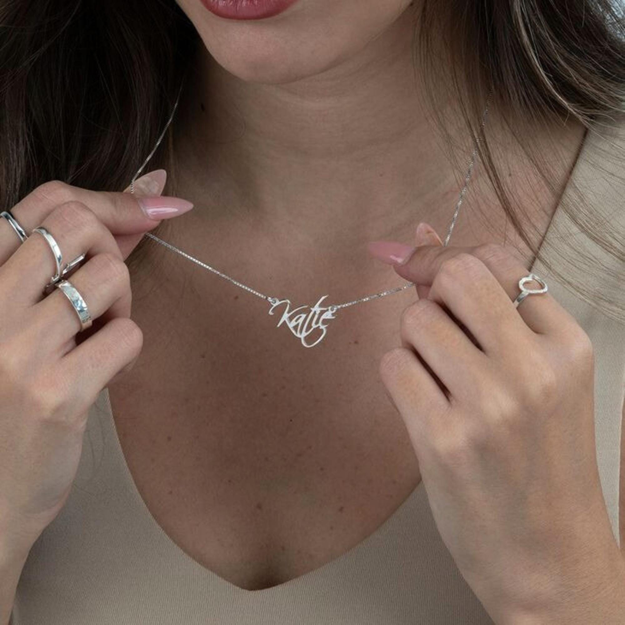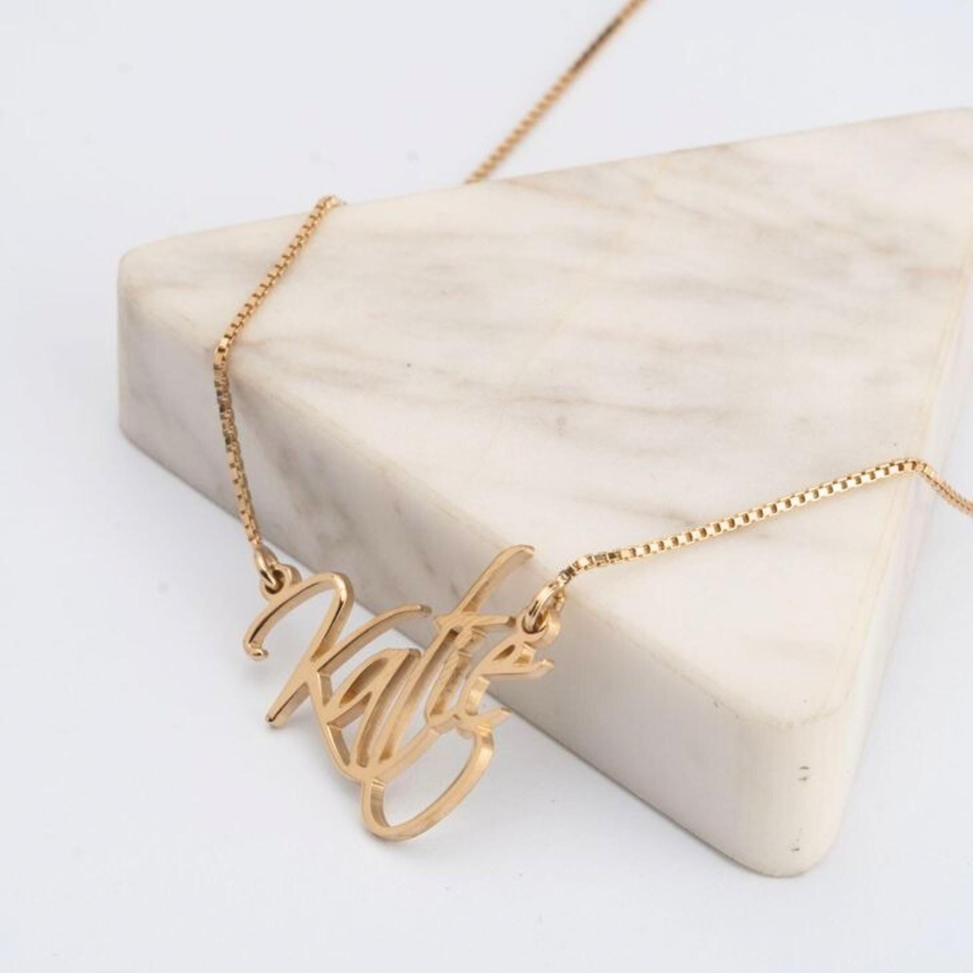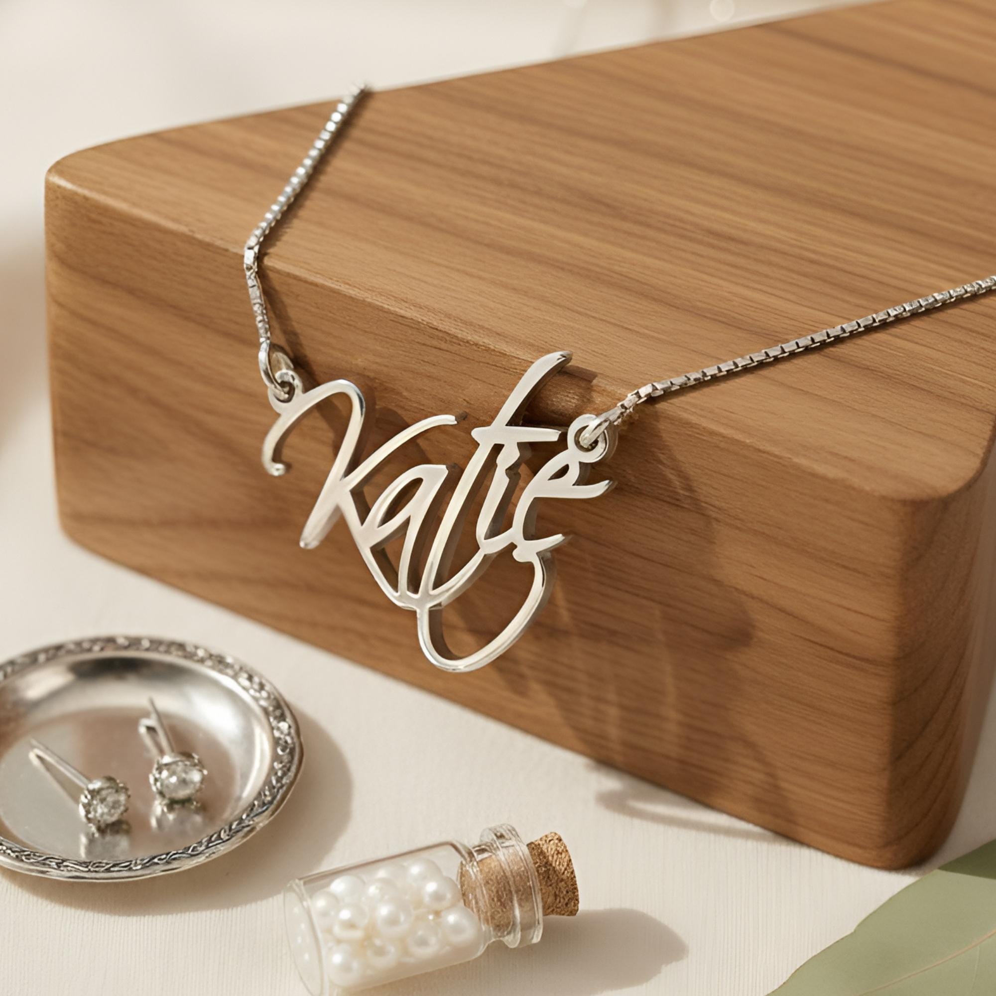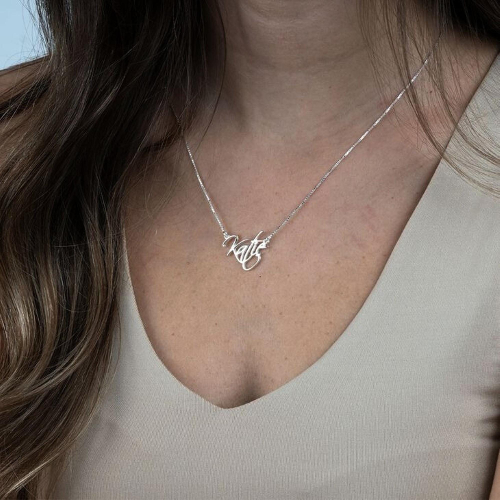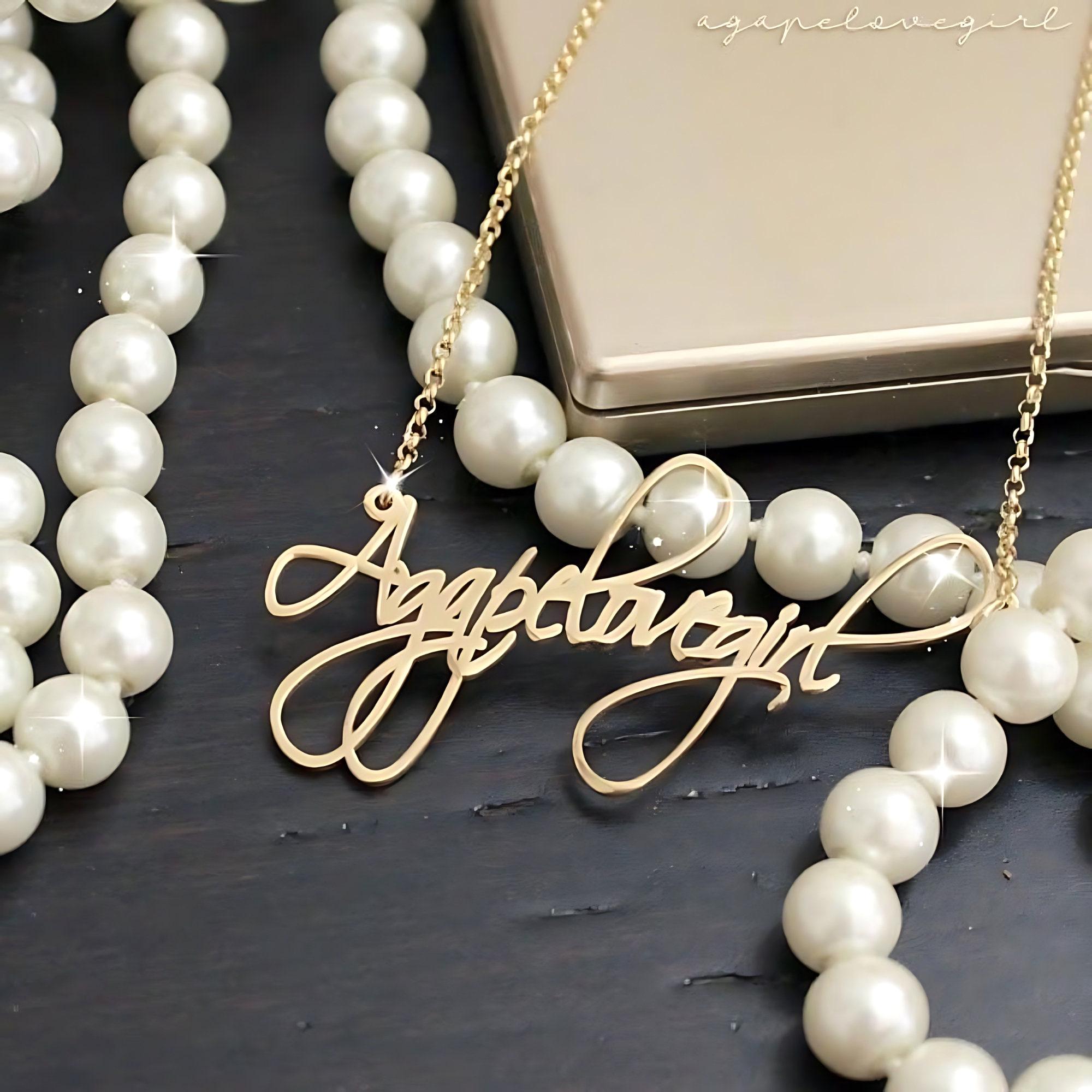 Featuring a beautiful signature nameplate in a cursive handwriting font, this necklace adds an elegant touch to any outfit.