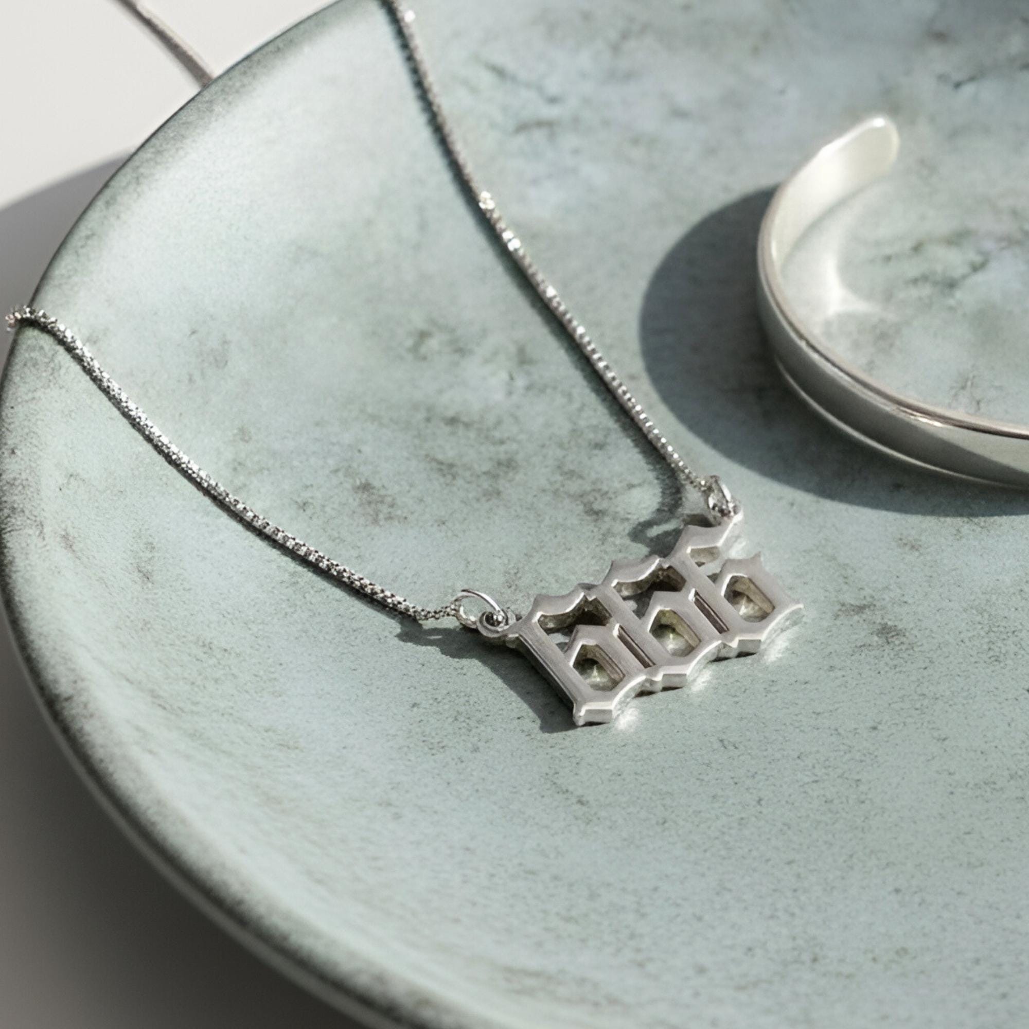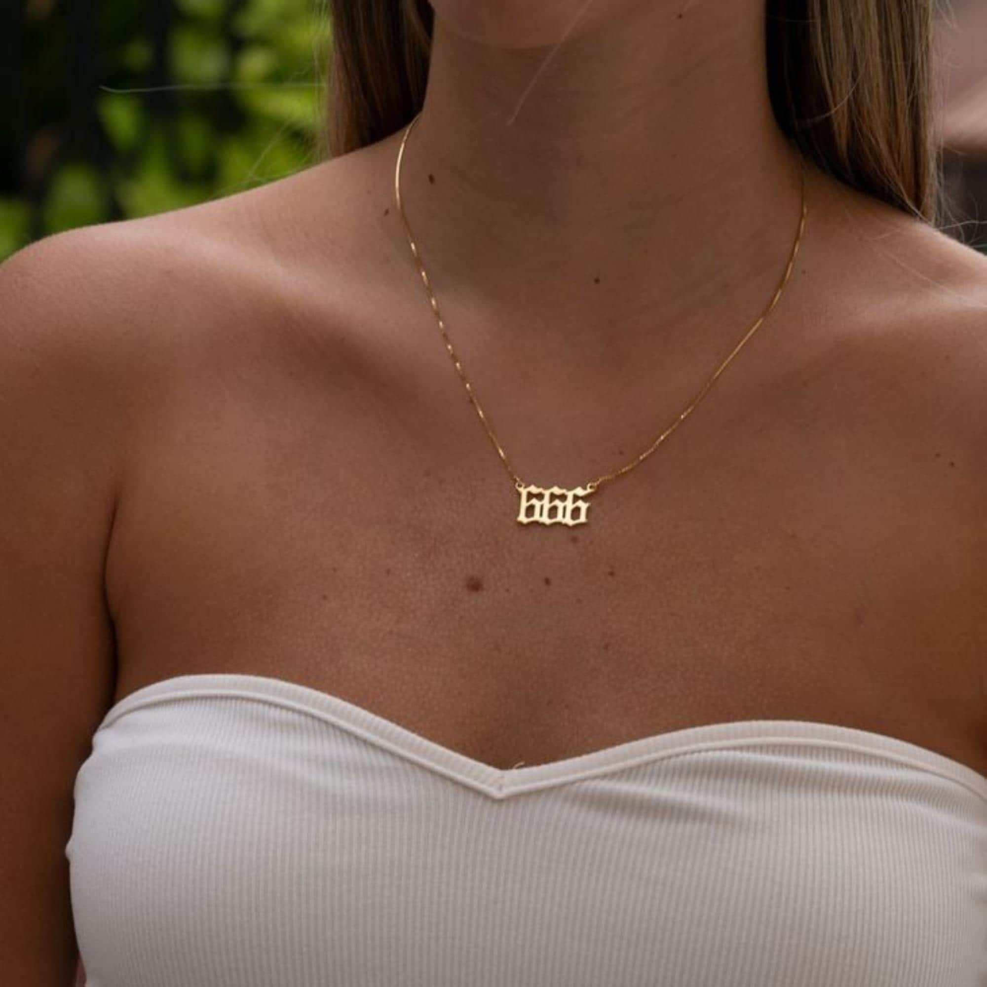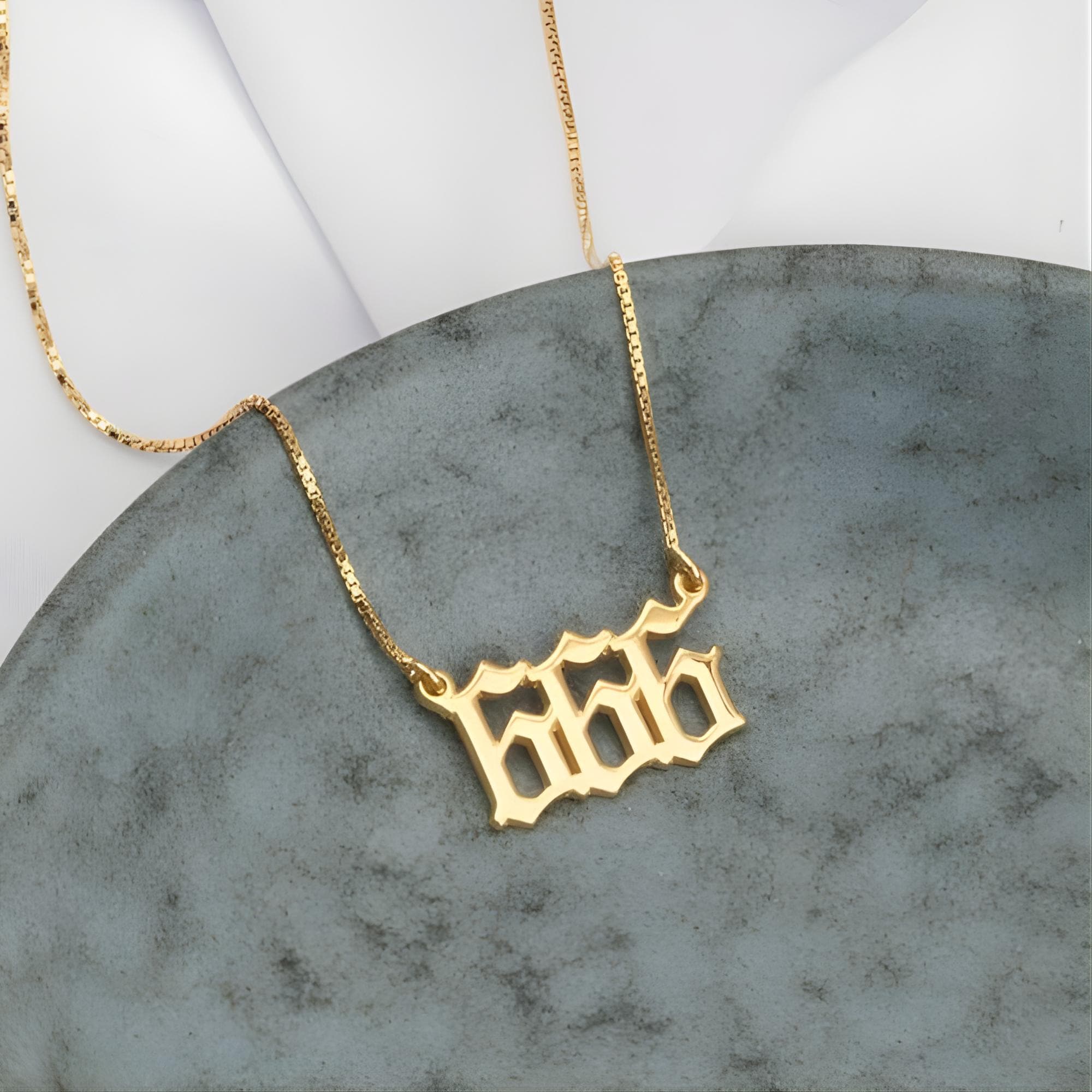 This Custom Angel Number Necklace features your chosen angel number in a bold Old English font, handcrafted in sterling silver or plated in 24K gold or rose gold.
