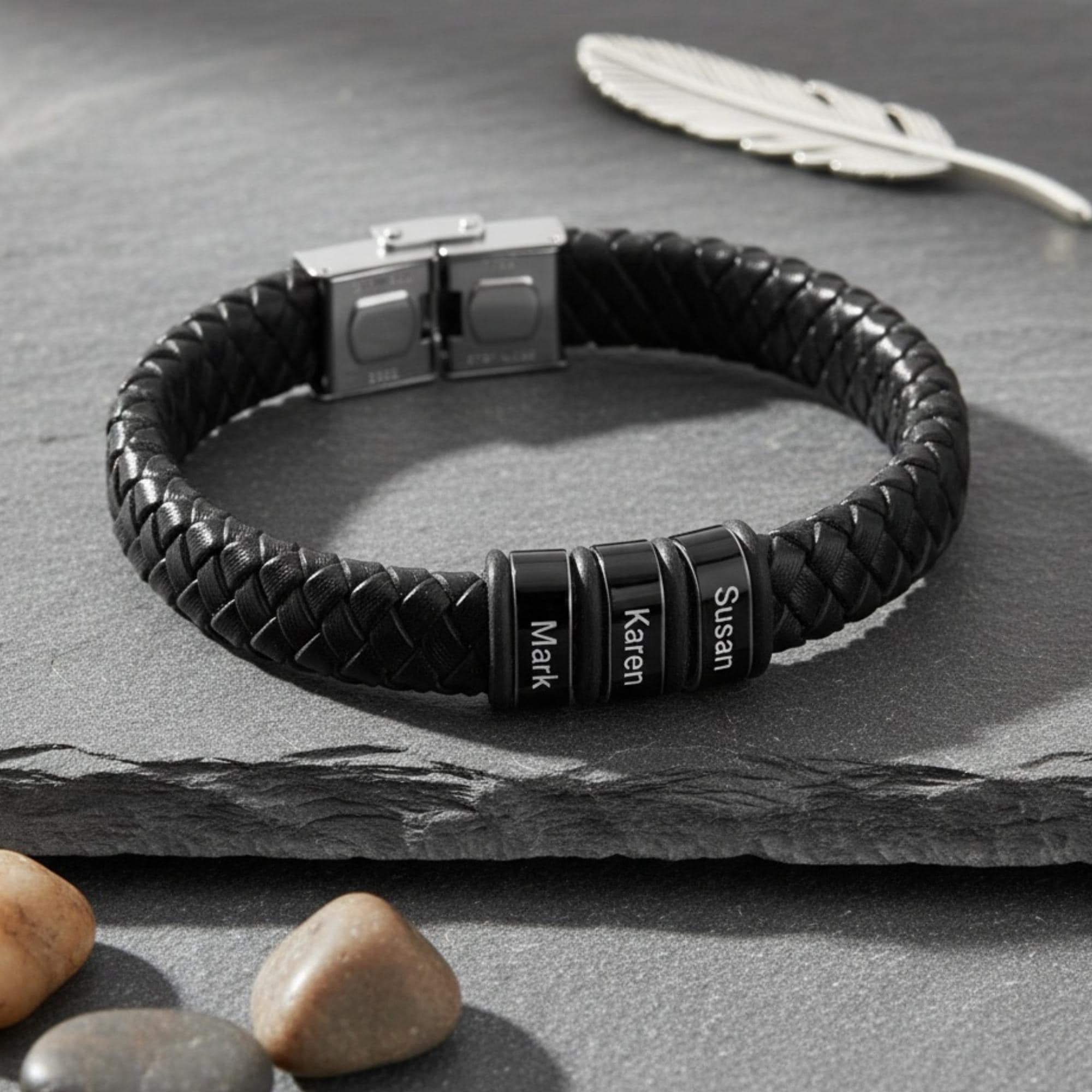 💼 Celebrate your family with this personalized Dad Bracelet, made from high-quality black braided leather and custom engraved with your kids' names. This stylish cuff bracelet is the perfect Father's Day gift or a thoughtful present for Grandpa, allowing him to proudly display the names of his children or grandchildren on his wrist.