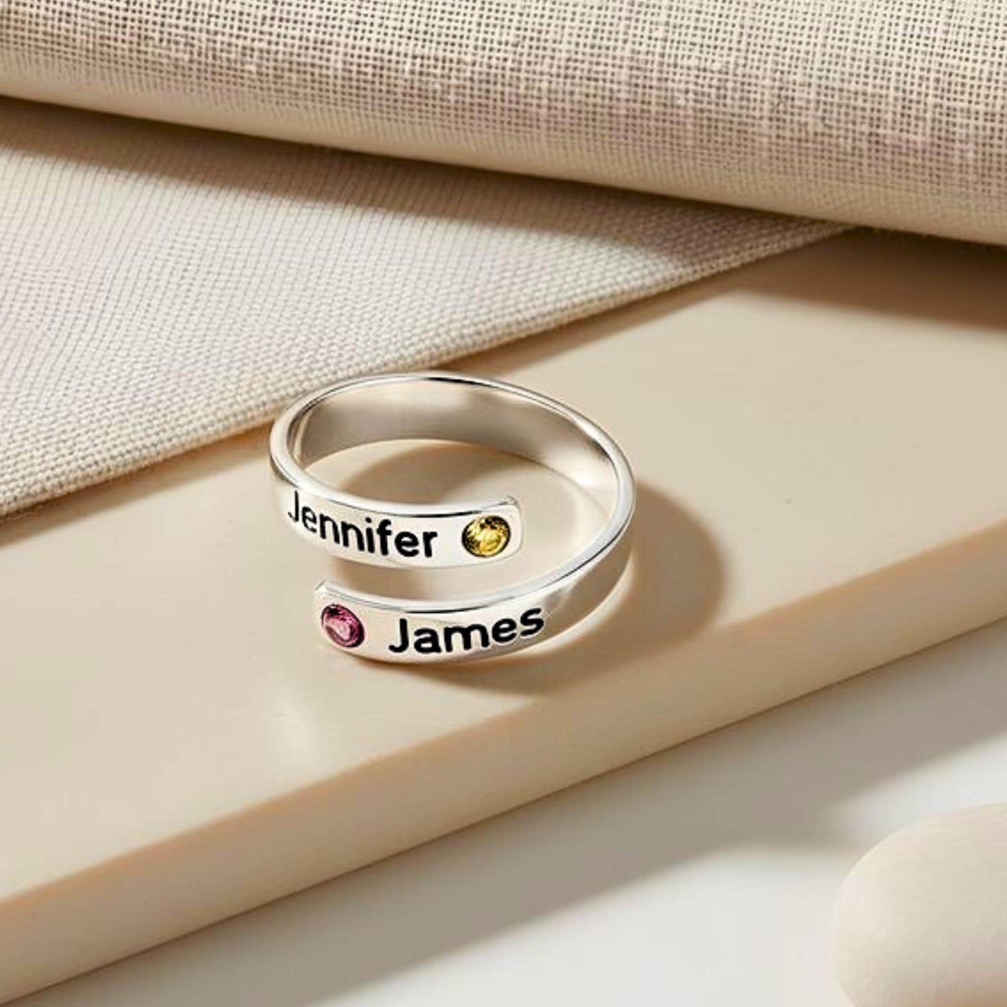 Style: Personalized wrap ring with two birthstones and names.