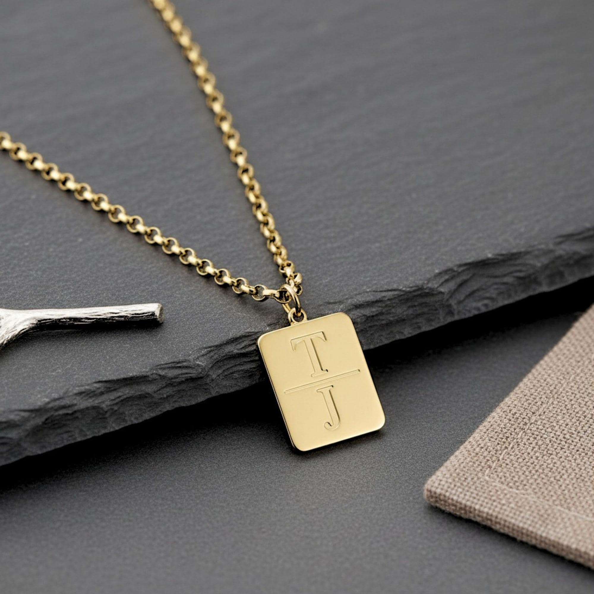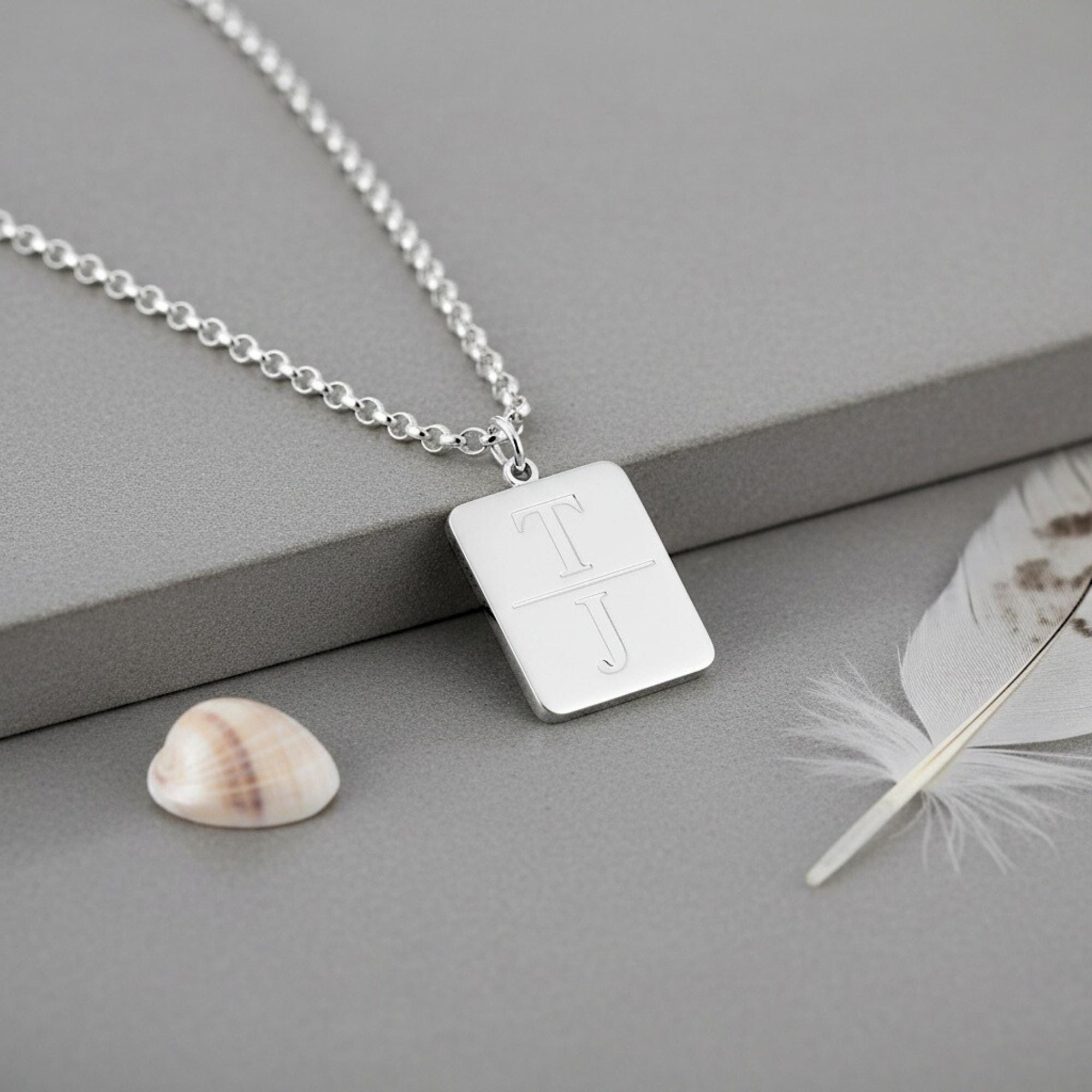 Each rectangular pendant is engraved with two initials, turning a clean design into a personal keepsake.