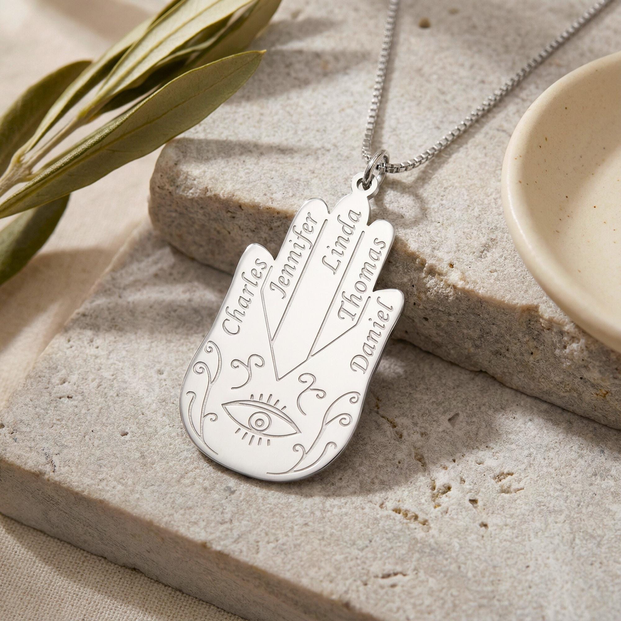 It features custom-engraved kids' names on a beautifully crafted Hamsa pendant.