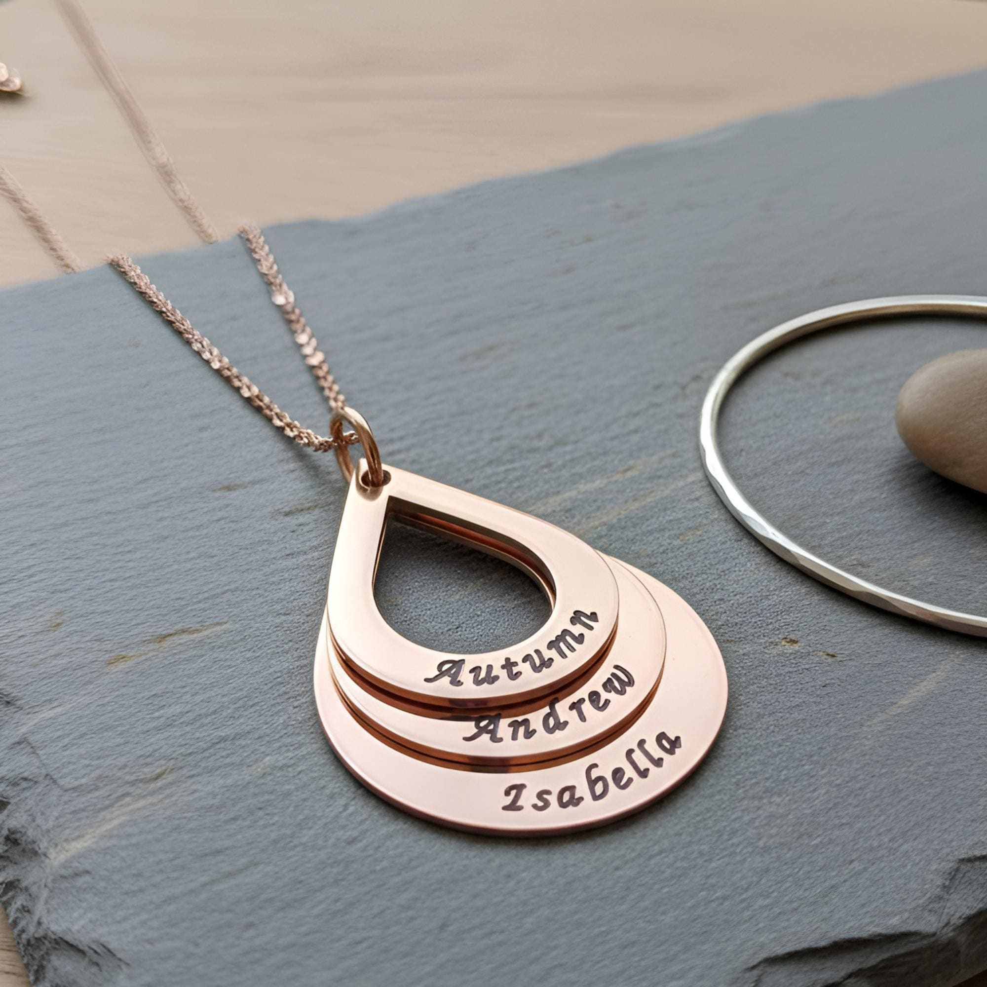 • Personalized teardrop pendants engraved with children’s names