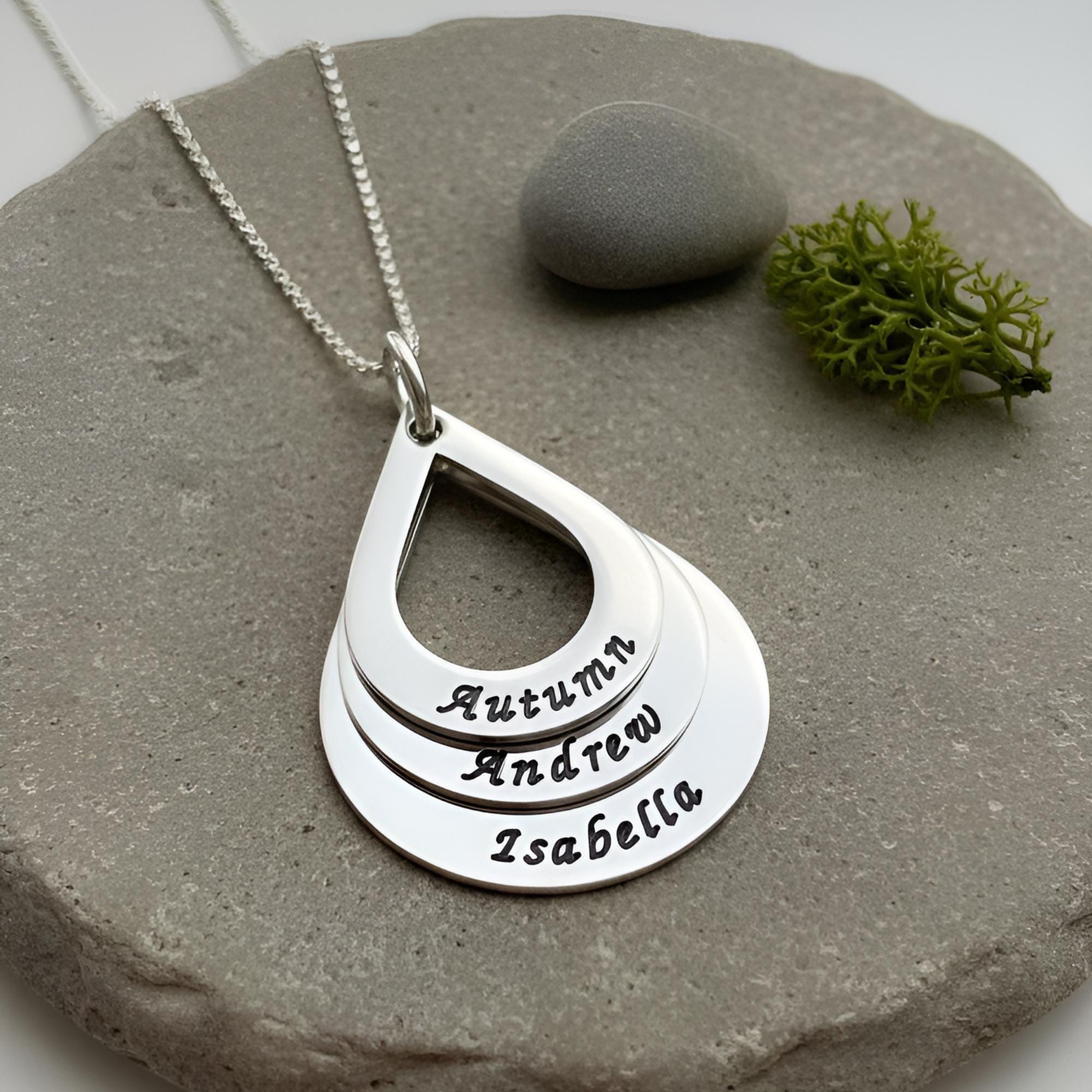 Designed especially for moms and grandmas, this personalized necklace features 1–5 teardrop pendants, each engraved with a child’s name.