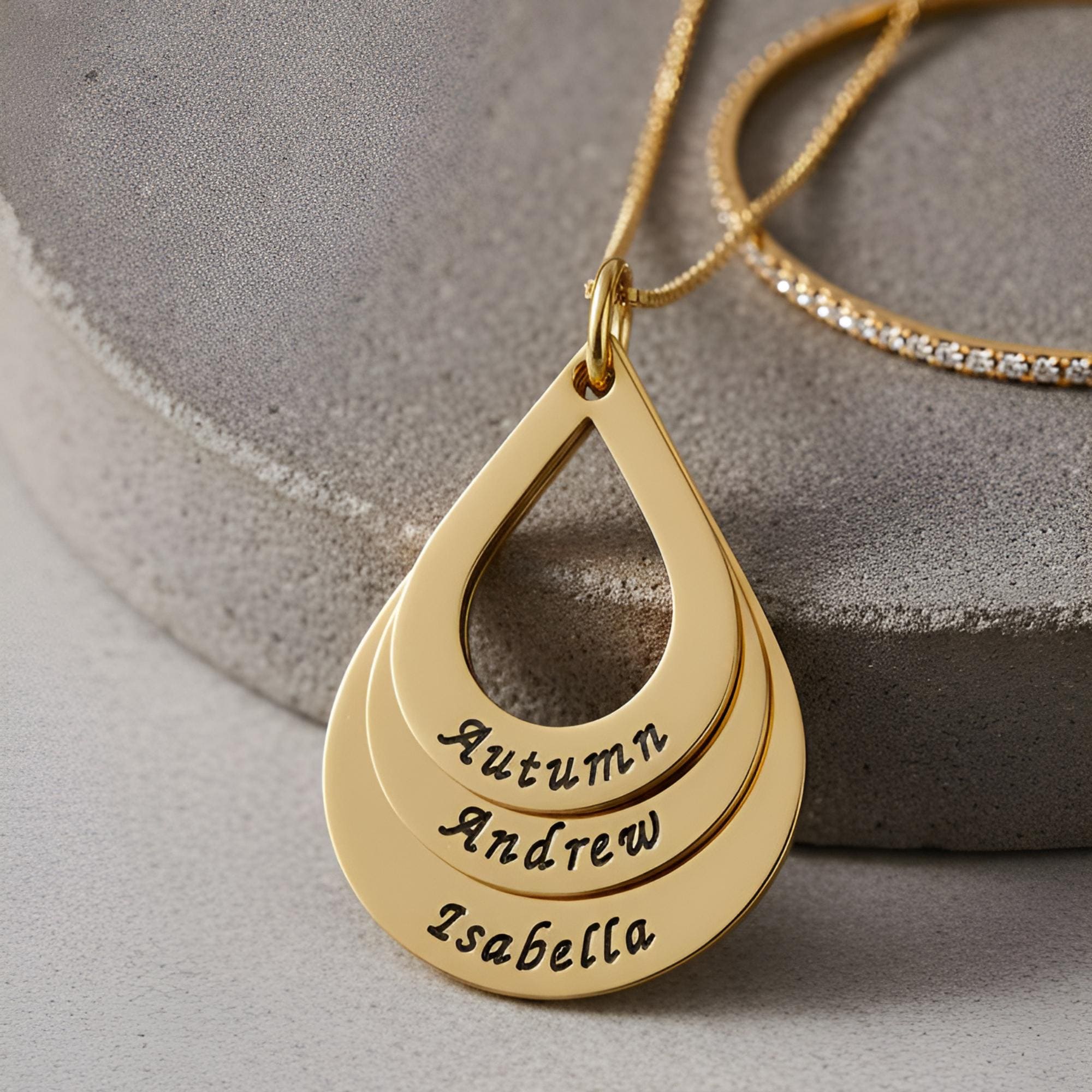 Handcrafted in your choice of sterling silver, gold-plated, or rose gold-plated finish, each teardrop pendant is engraved with precision to create a custom mom necklace that is both elegant and timeless. The teardrop shape offers a soft, graceful look, while the polished finish ensures durability for everyday wear. Add one name or up to five to create the perfect mother’s necklace with kids’ names.