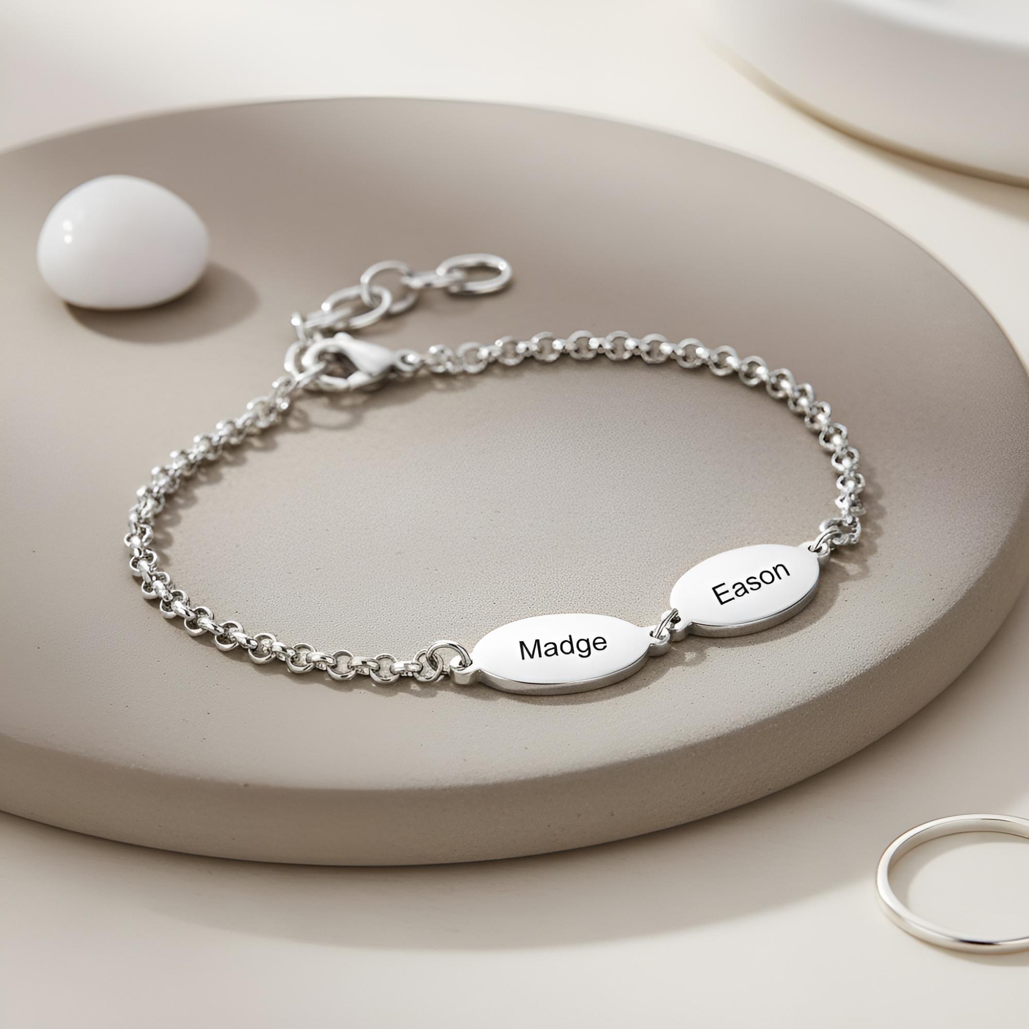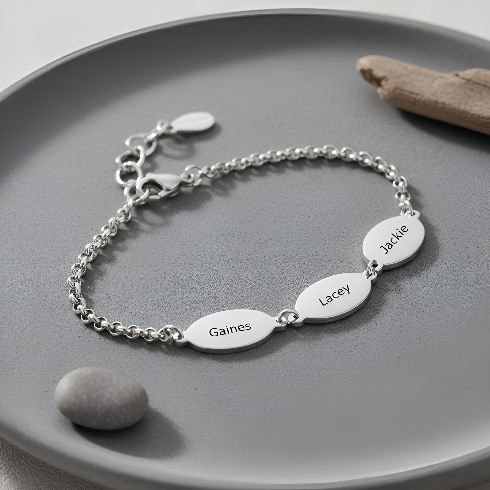 Handcrafted from high-quality 925 Sterling Silver with optional 24K Gold Plated or Rose Gold finishes, this bracelet features delicate engraved charms personalized with each child’s name.