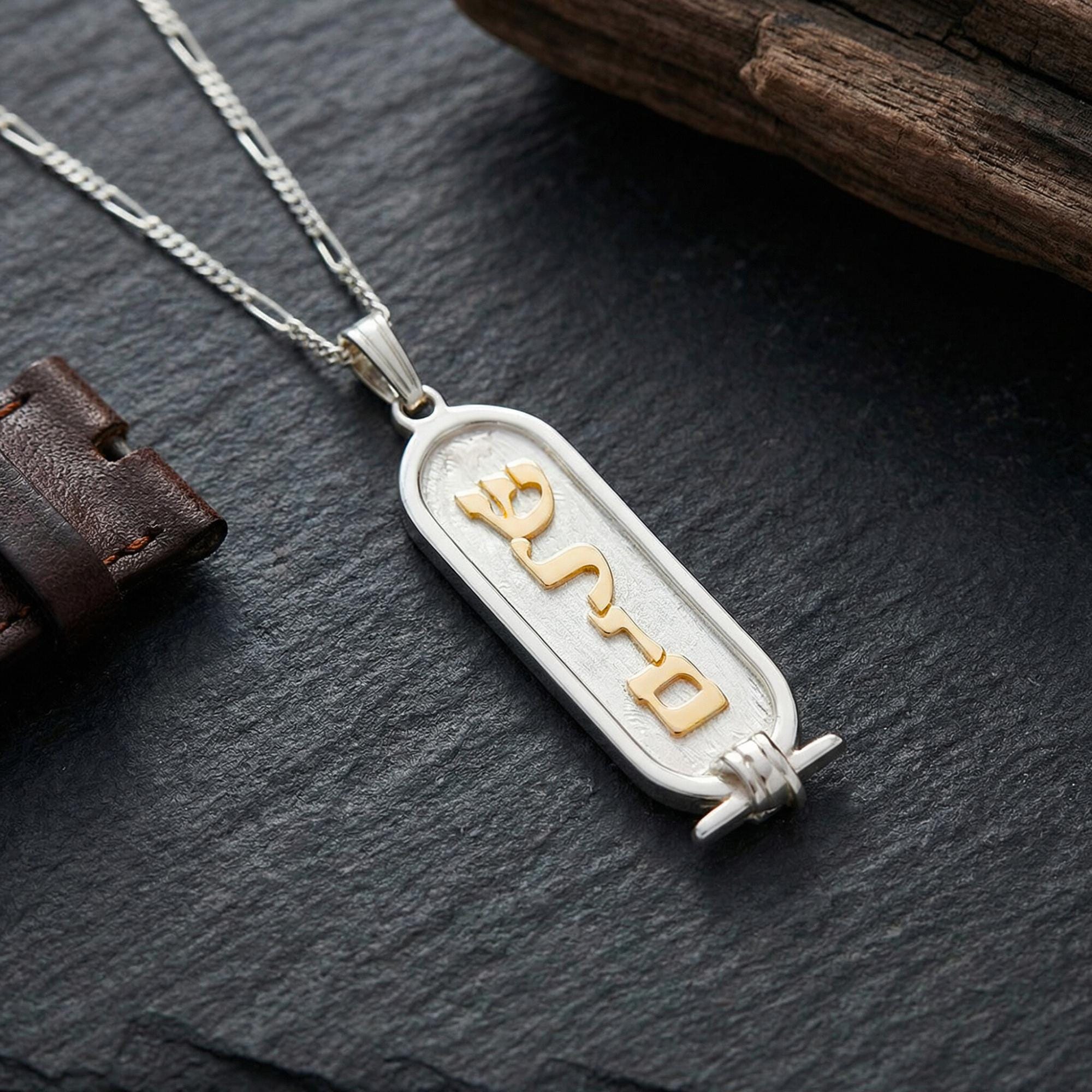 Celebrate tradition and timeless elegance with this Hebrew Cartouche Name Necklace, handcrafted in Israel. Inspired by ancient Egyptian cartouche designs, this piece combines cultural heritage with modern style, making it a meaningful Jewish gift for Hanukkah, birthdays, or any special occasion. Personalize it with a Hebrew name for a truly one-of-a-kind necklace.