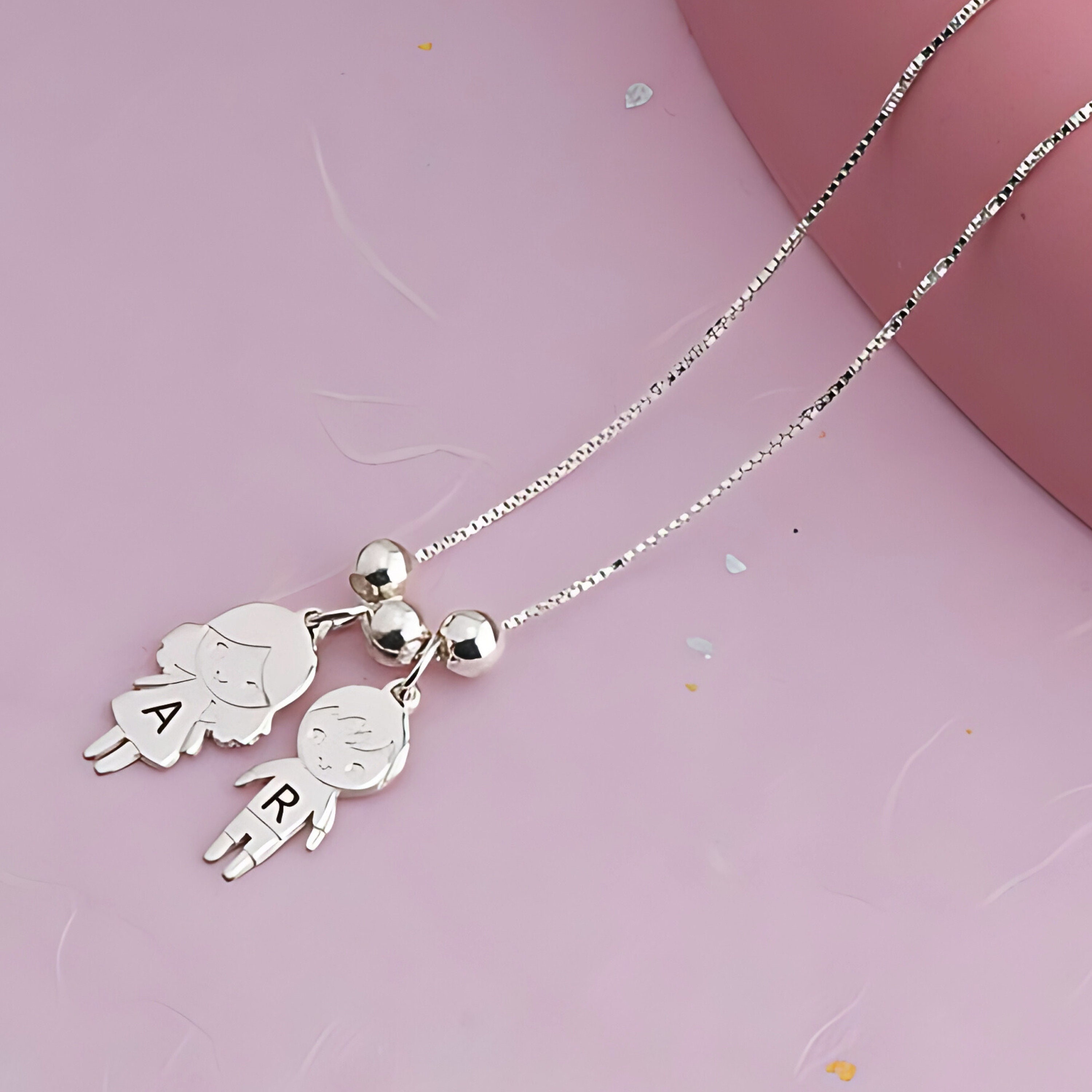 Handmade from 925 sterling silver, this elegant necklace features engraved initials on delicate boy and girl charms, each accented with tiny silver beads for extra elegance.