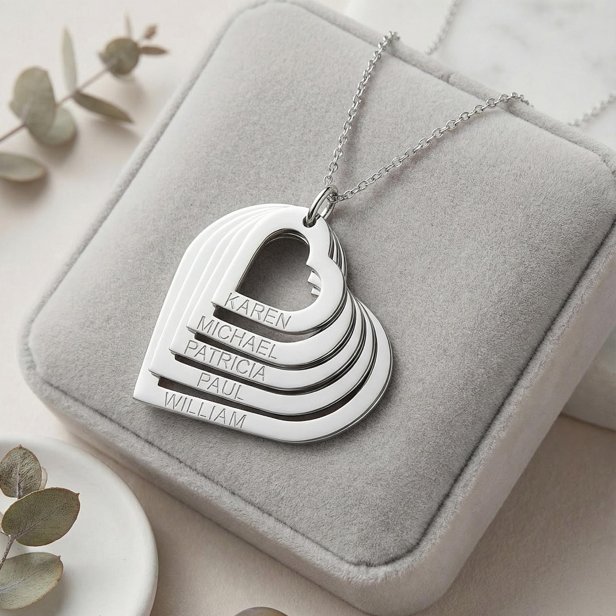 A: You can add up to 5 names, depending on the number of heart pendants.