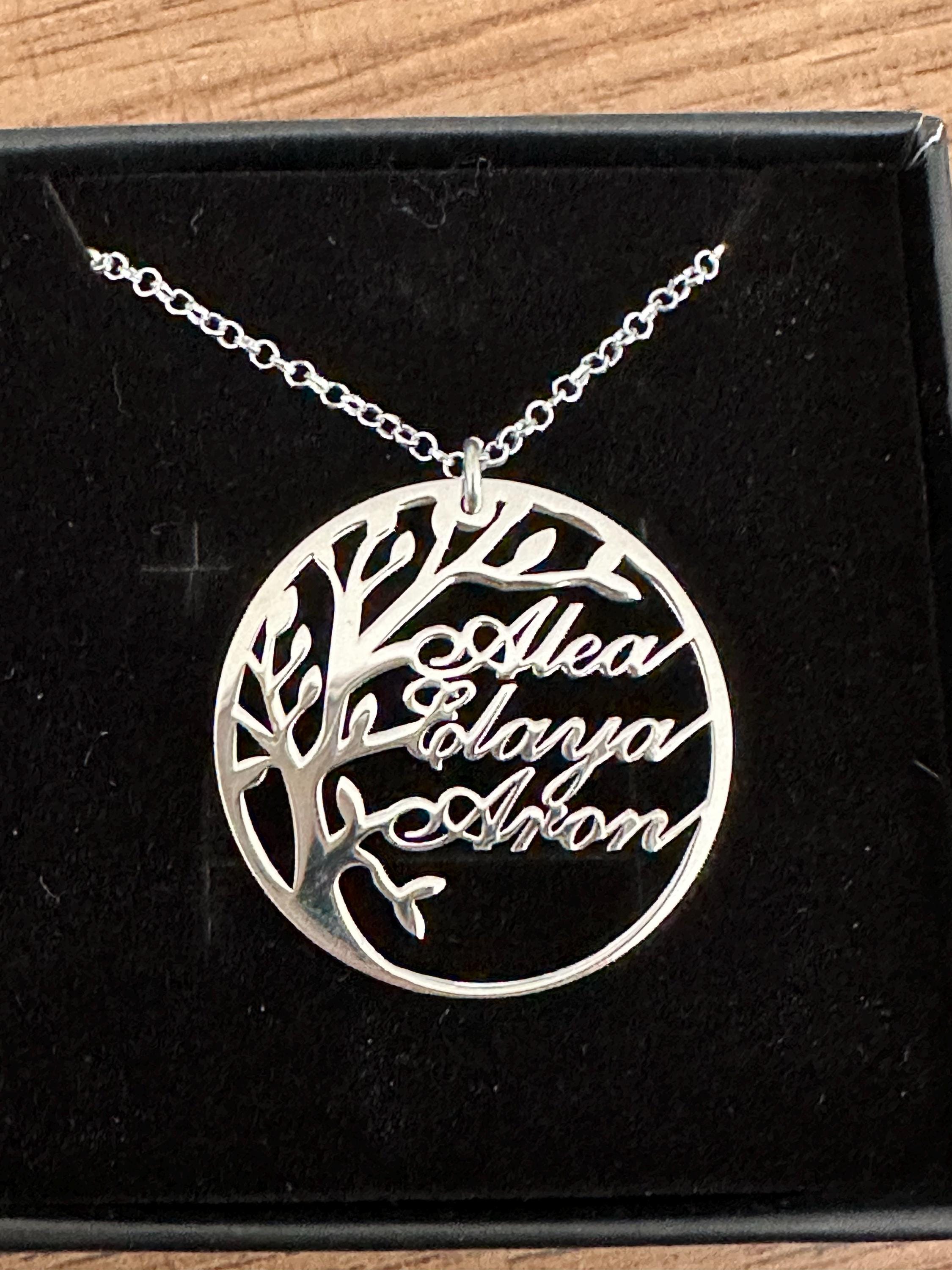 This Personalized Tree of Life Necklace beautifully captures the love of family with up to four custom kidsâ names gracefully integrated into a laserâcut Tree of Life pendant.