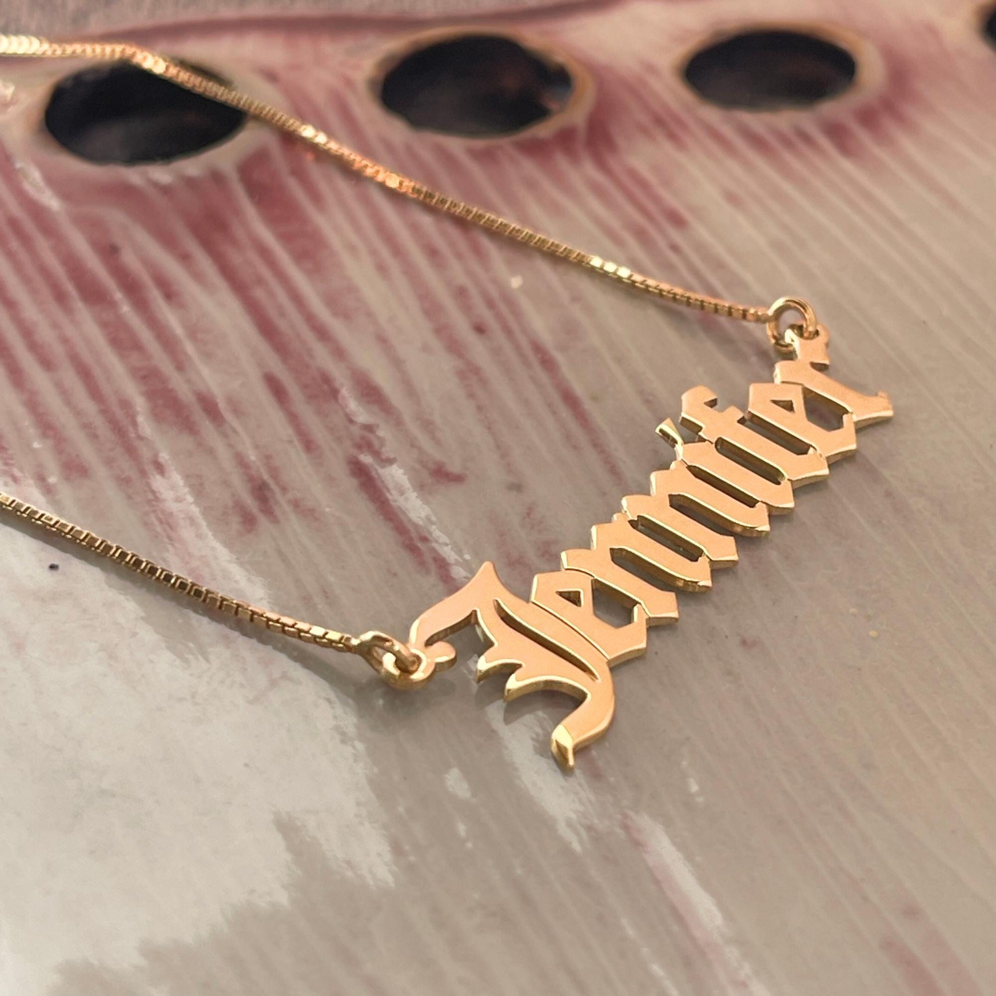 14K Solid Gold Old English Nameplate Necklace – Gothic Name Jewelry