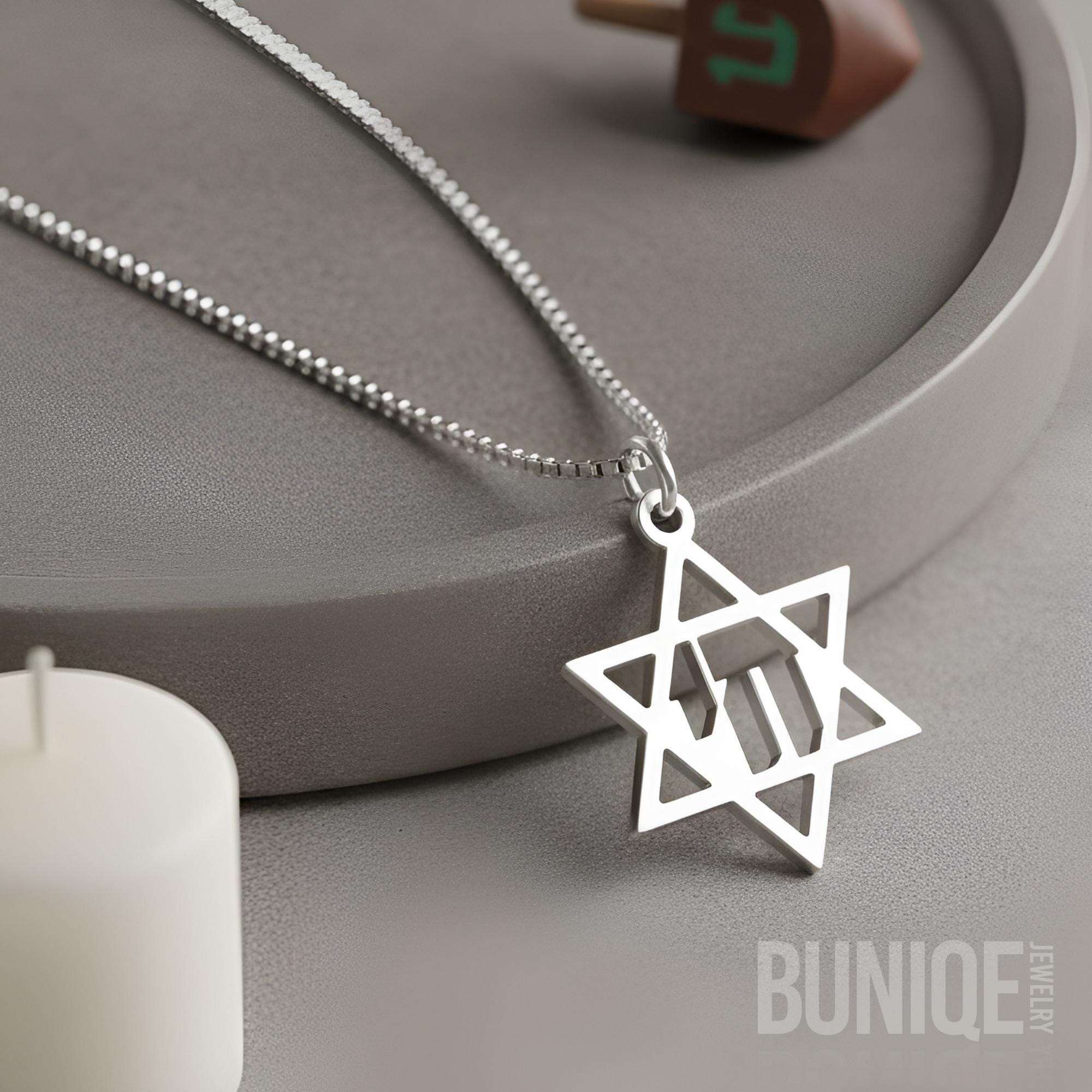 Combining the Magen David (Shield of David) and the Chai (חי) symbol, this pendant represents life, strength, and divine protection.
