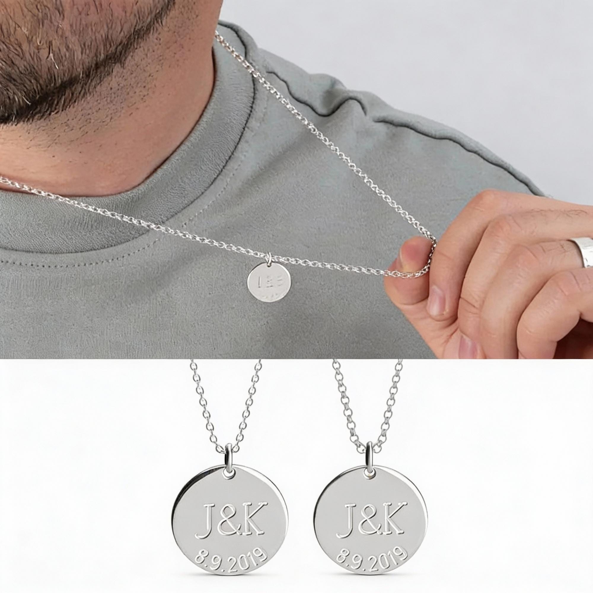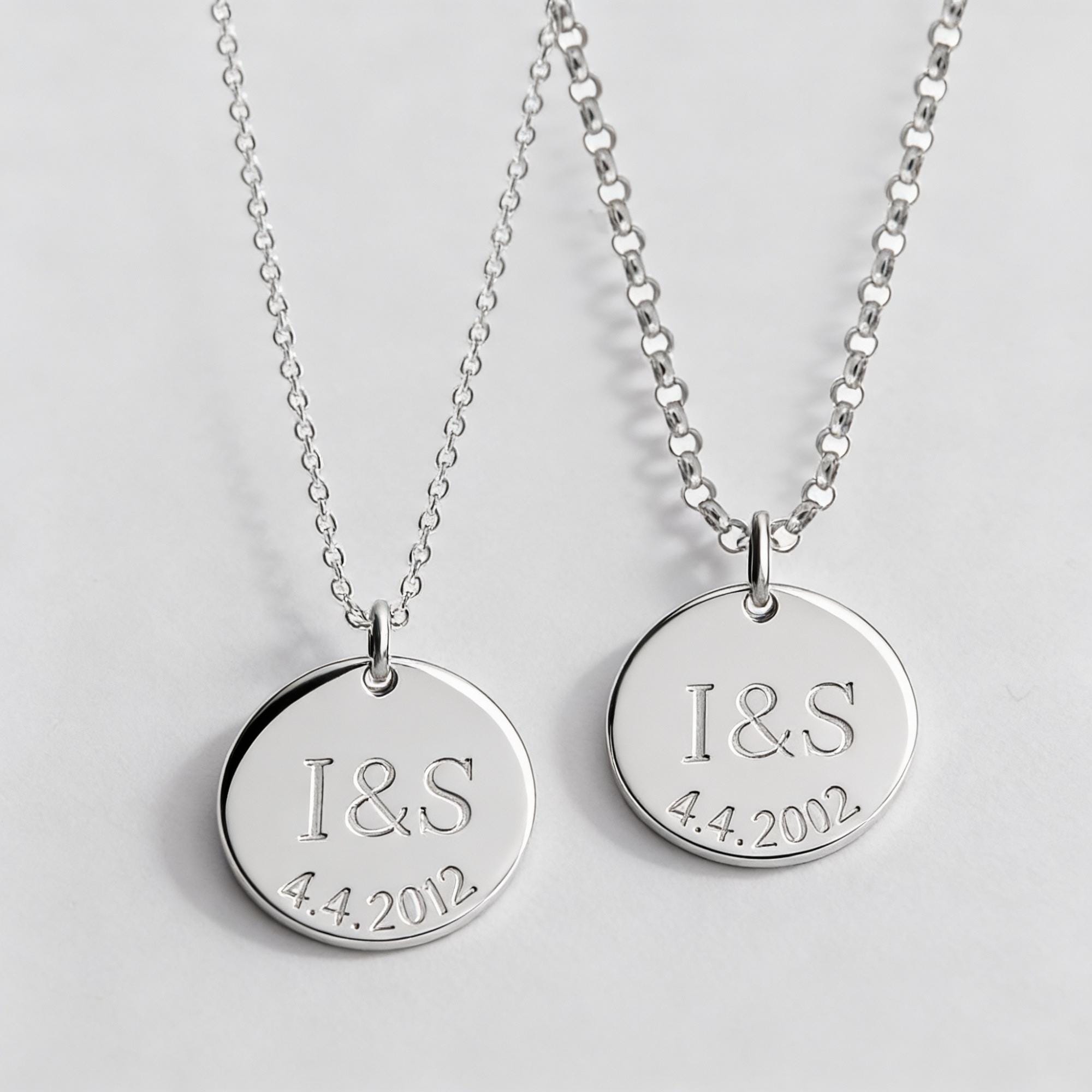 Each set is engraved with two initials and a date, coin pendants, on a delicate Rolo chain for her and a bold Rolo chain for him.
