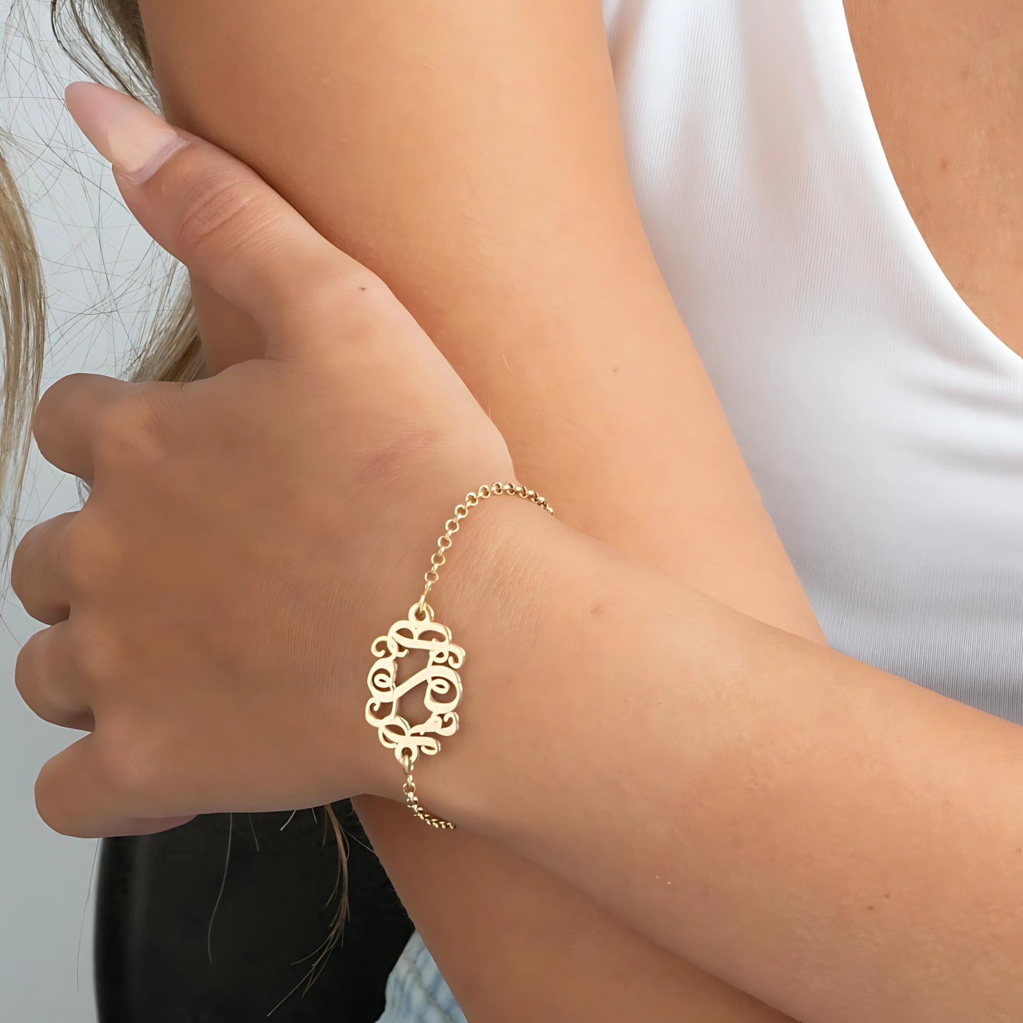 It's a personalized bracelet that features three intertwined letters in cursive font.