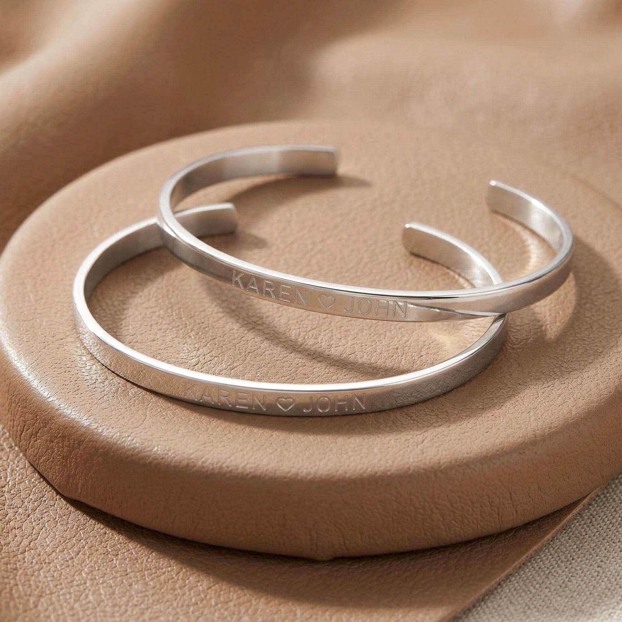 Handcrafted in sterling silver, these minimalist open bangles are personalized with names, dates, or meaningful words, creating a timeless his-and-hers keepsake for everyday wear or special occasions.