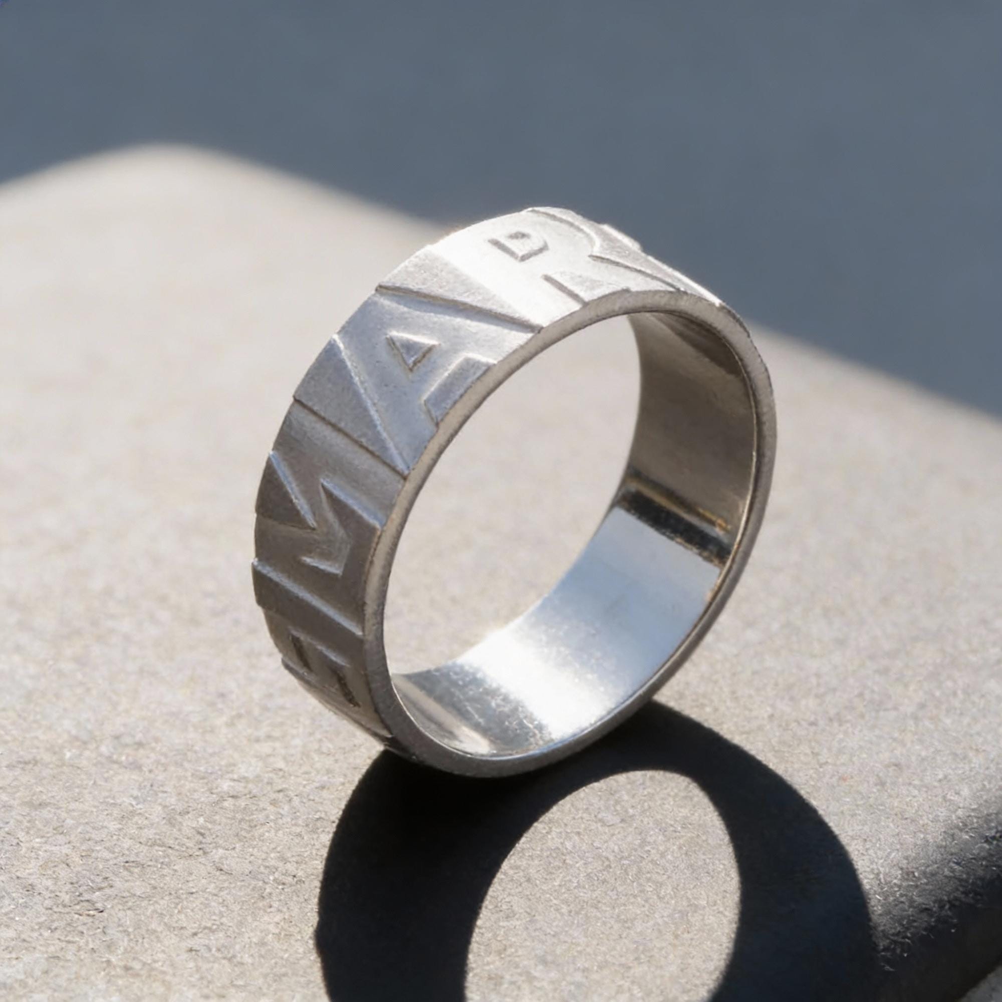 Featuring a wide matte band and clean, engraved lettering, it’s a bold, timeless statement that combines everyday wear with deep personal meaning.