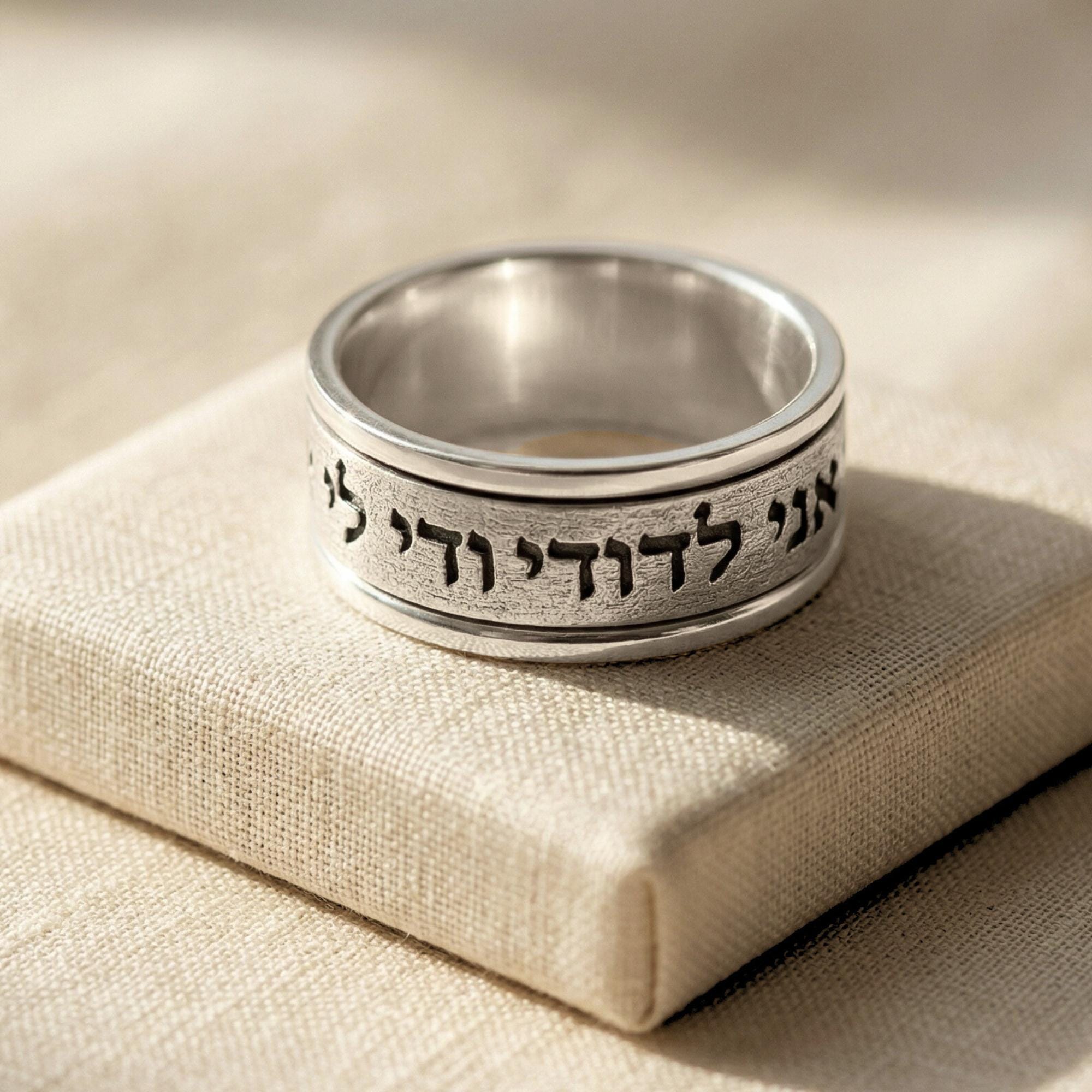 Featuring meaningful verses like "I Am My Beloved," "Song of Solomon," and "This Too Shall Pass," this ring embodies timeless wisdom and love, making it a thoughtful Judaica gift.