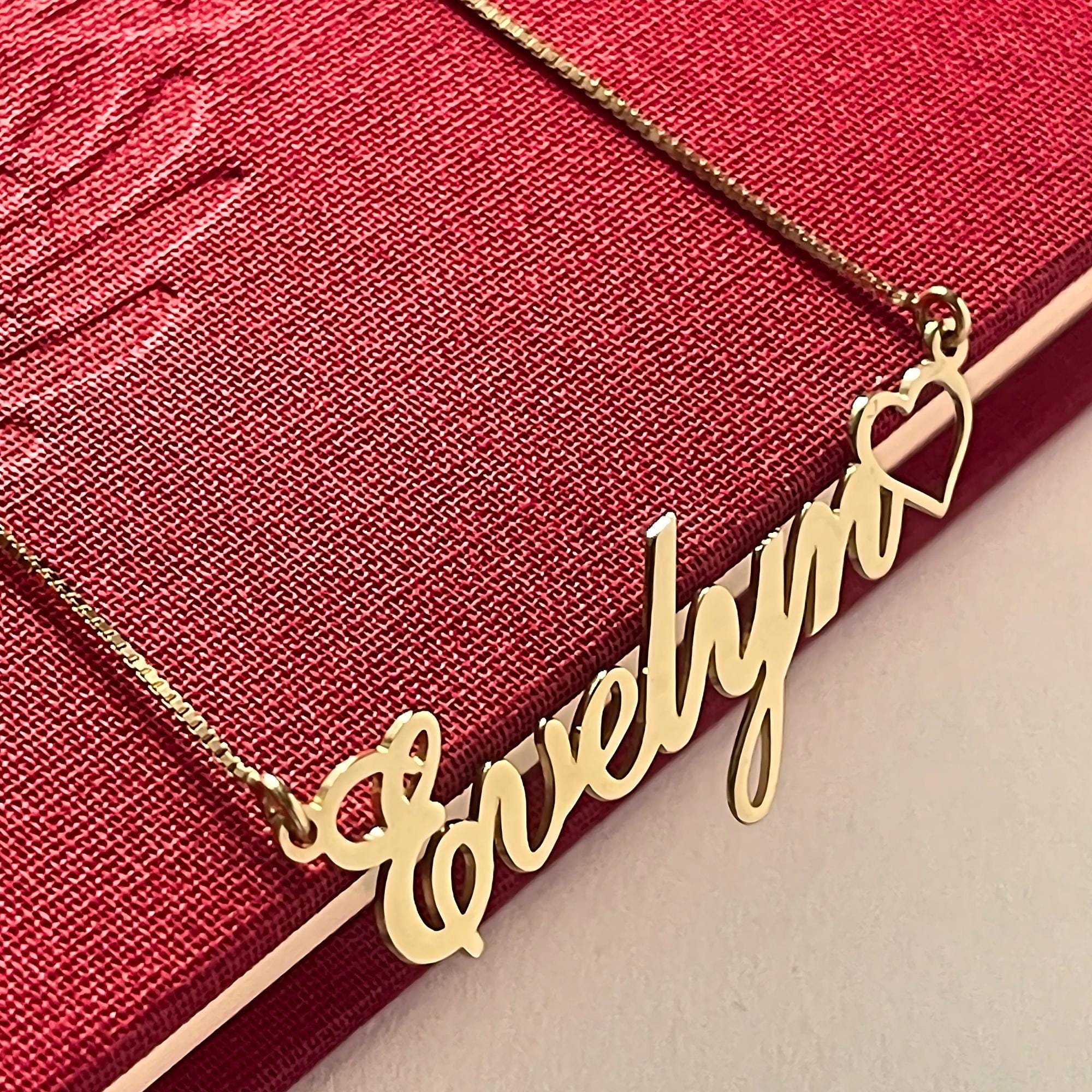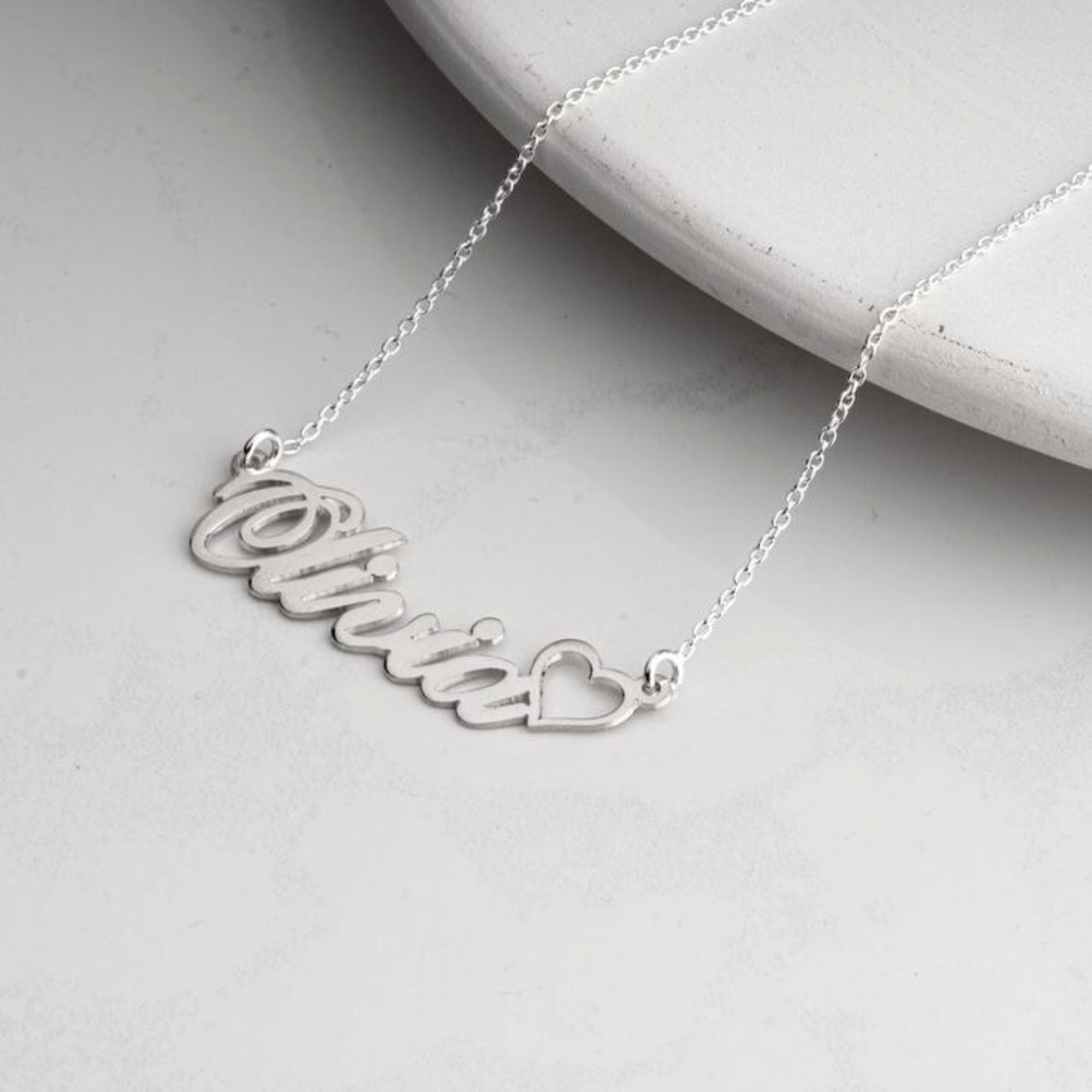 This heart-name pendant creates new and beautiful personalized jewelry with an open hollow heart. This nameplate necklace can be personalized with your name or a particular word and is available in 925 Sterling Silver, 24K Gold Plated, or Rose Gold Plated.