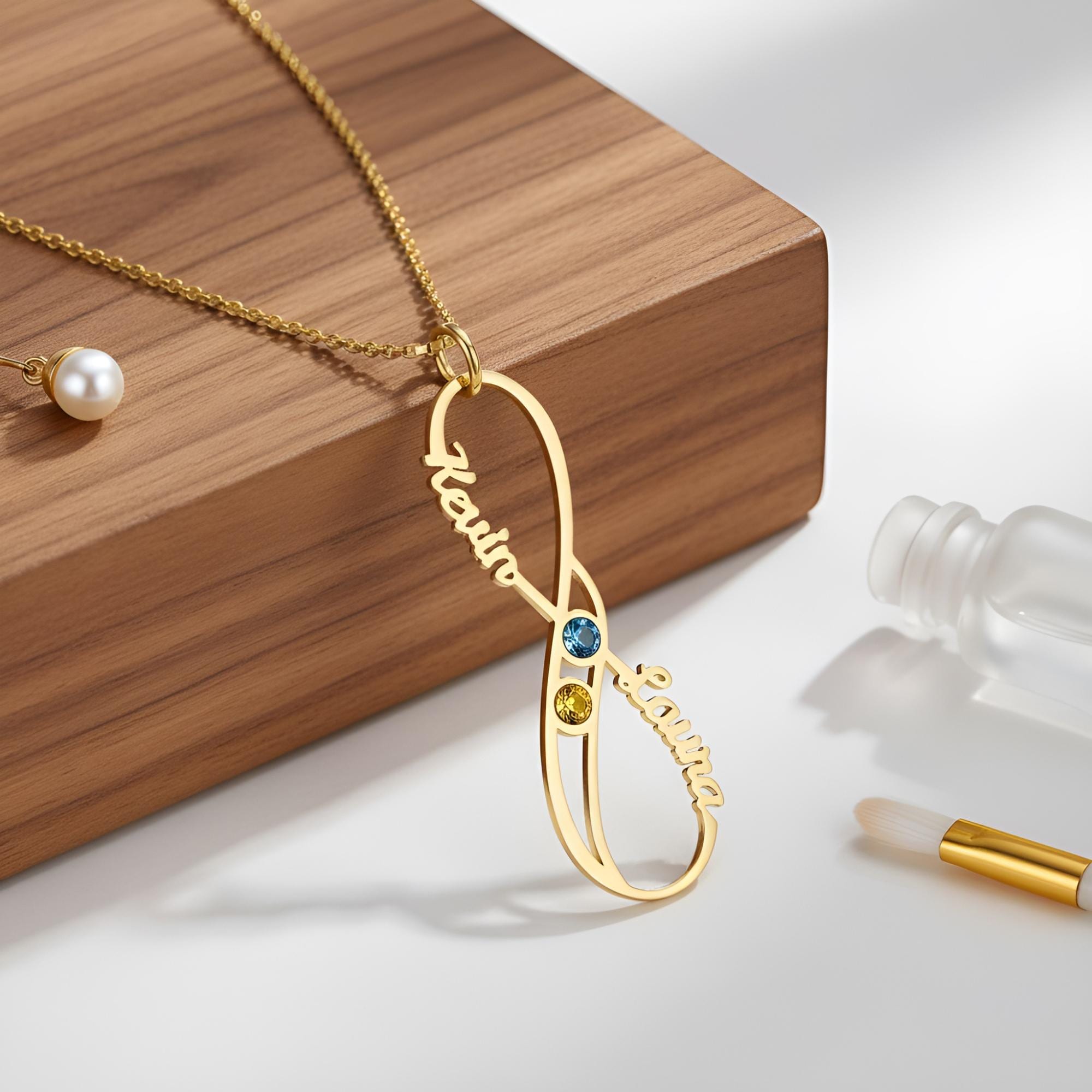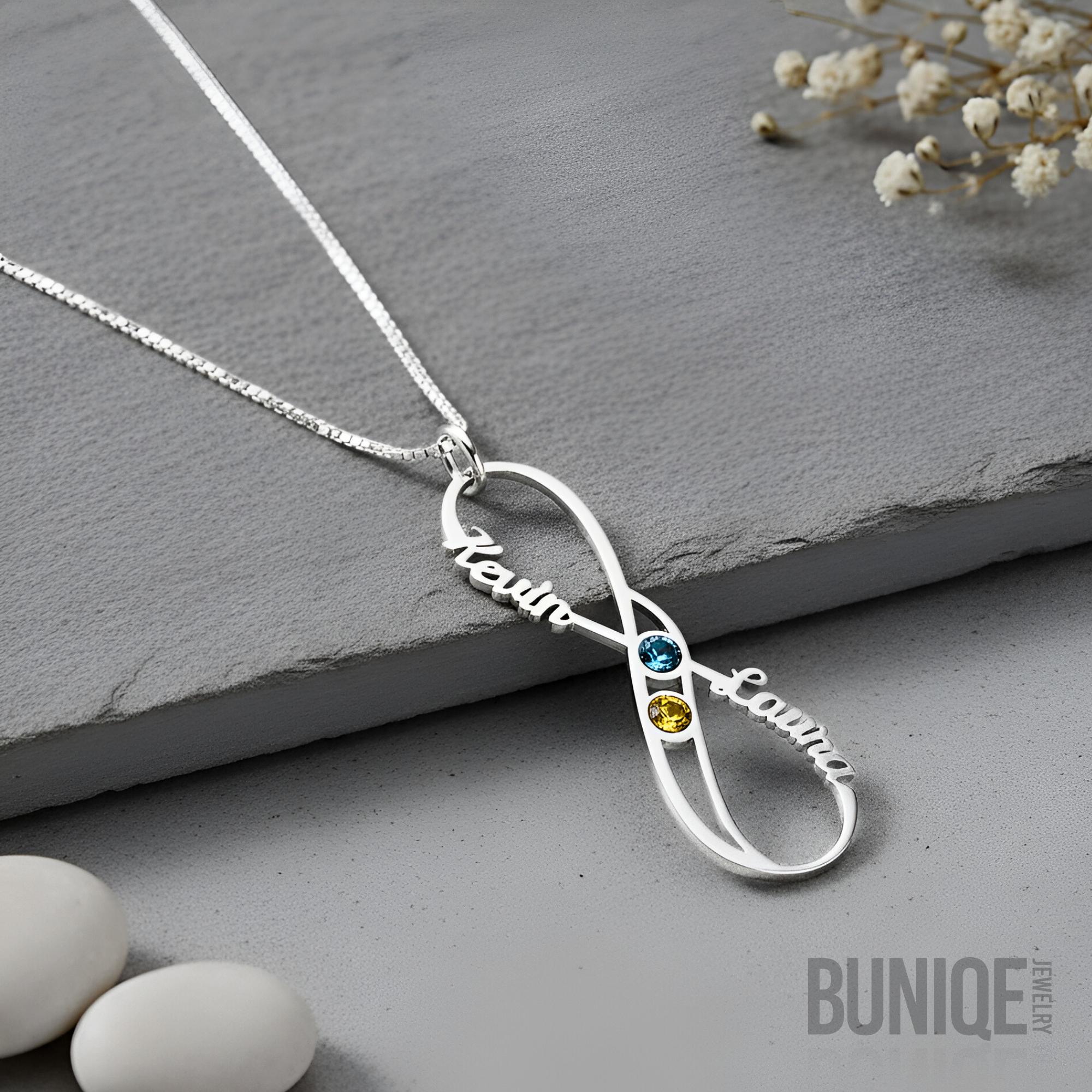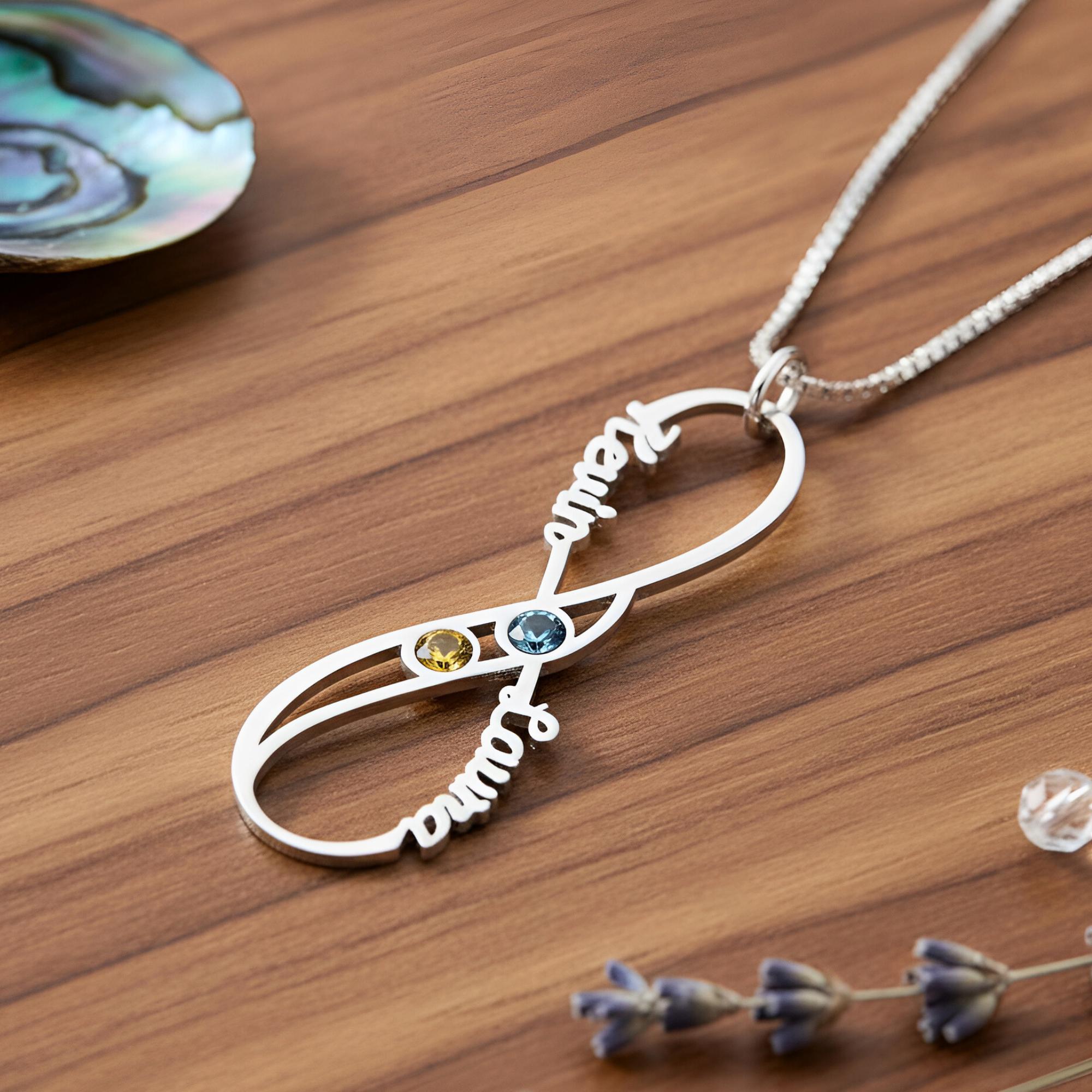 Featuring two engraved names and two sparkling Swarovski birthstones, this meaningful pendant represents the unbreakable bond between loved ones — a symbol of forever.