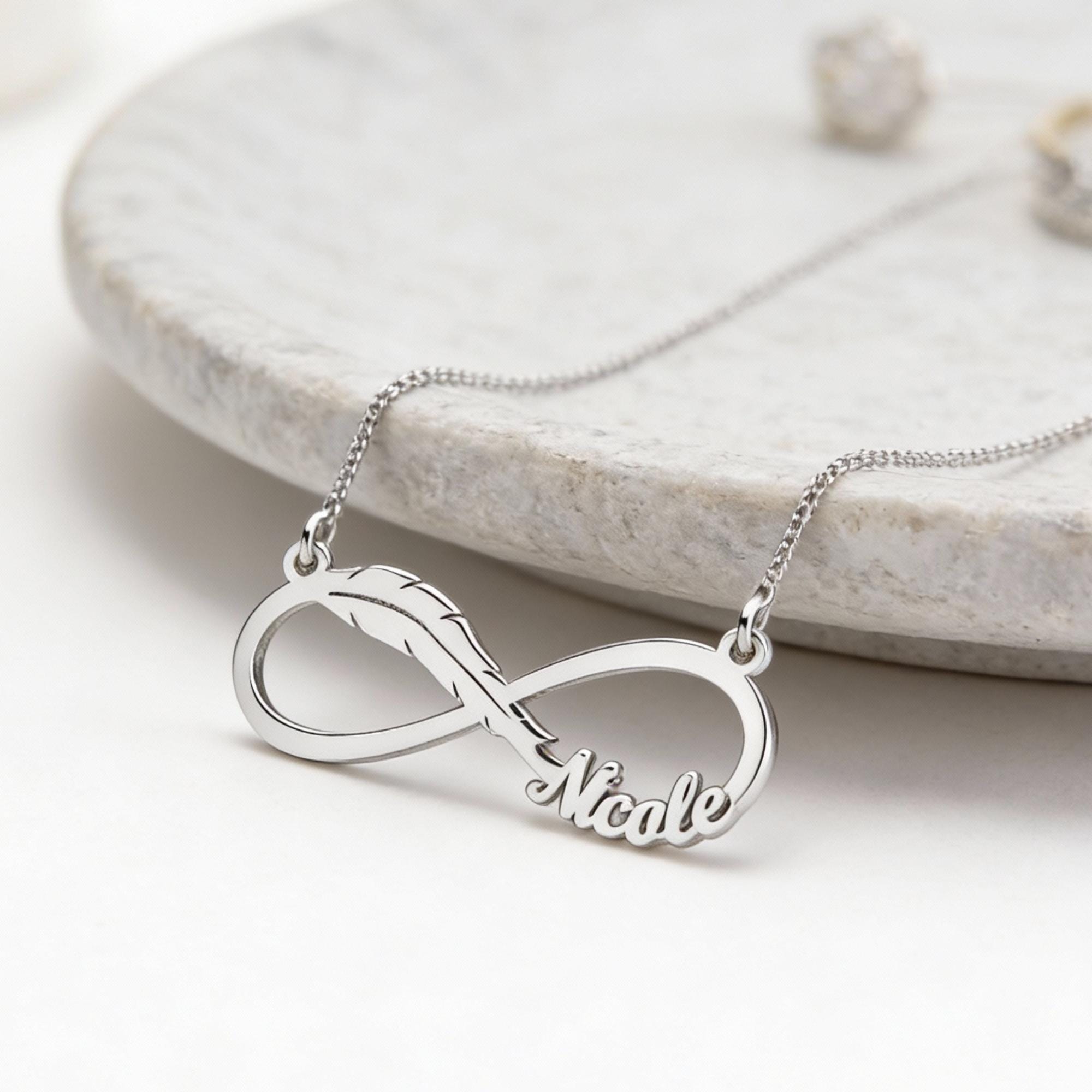 💎 This Infinity Necklace with a Feather and Name is crafted with the iconic infinity symbol, representing never-ending possibilities and love.