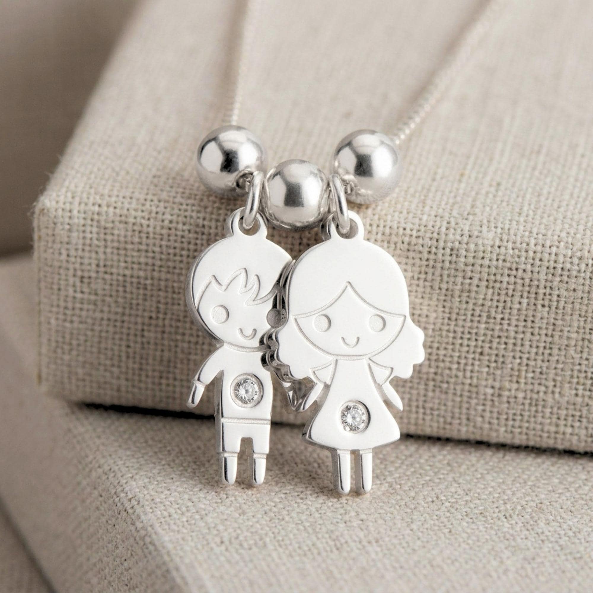 Celebrate the unbreakable bond of family with this Mother’s Necklace featuring little boy and girl charms accented with sparkling birthstones. Handcrafted in 925 solid sterling silver, each charm is engraved with your child’s name and adorned with a colorful birthstone, making this necklace both personalized and elegant.