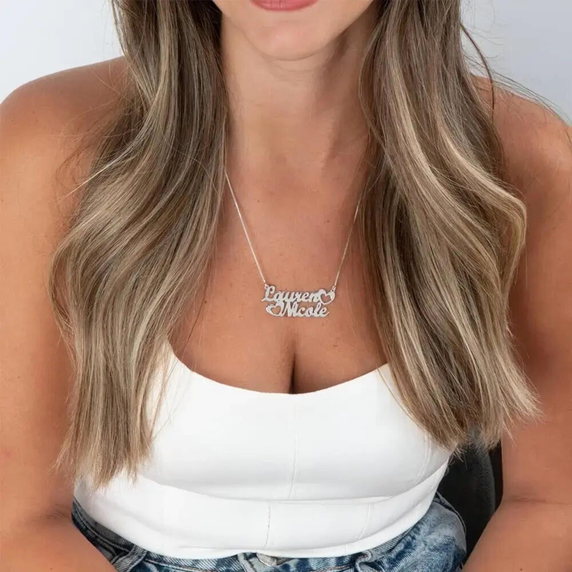The double-name pendant is crafted from high-quality materials, including 925 sterling silver, 24k gold, or rose gold plating, offering a personalized touch that will last a lifetime.