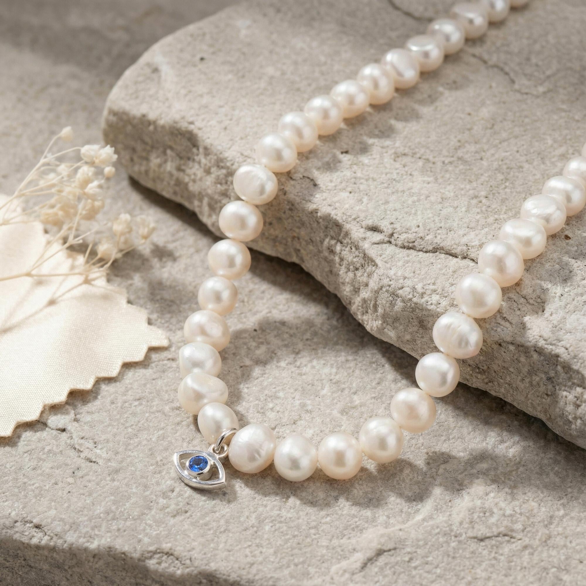 The symbolic evil eye charm offers protection, while the natural pearls add an elegant touch, making this piece an ideal gift for bridesmaids or loved ones.