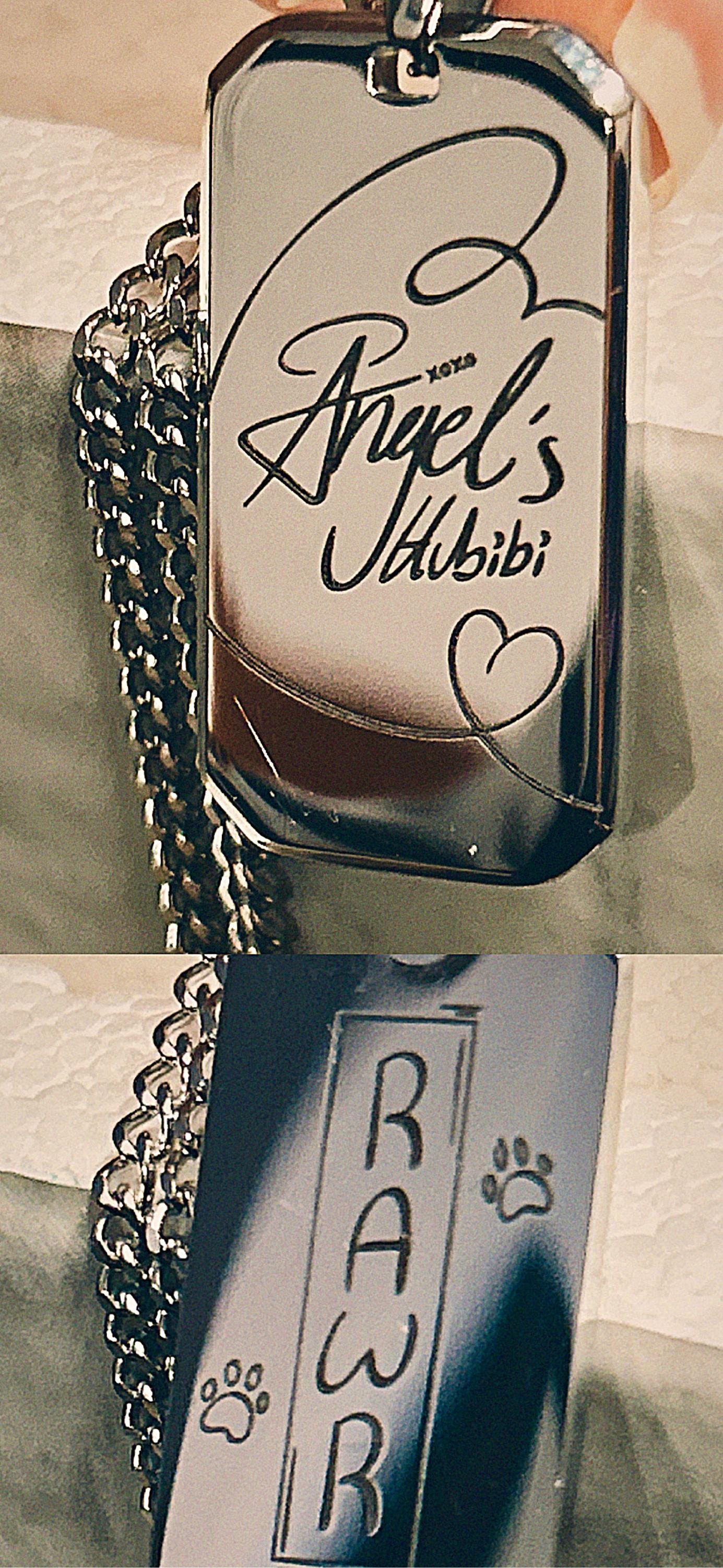 Crafted from premium silver stainless steel, the necklace features a sleek black dog tag pendant that can be custom engraved with a picture, handwriting, names, date, initials, or logo on one or both sides.