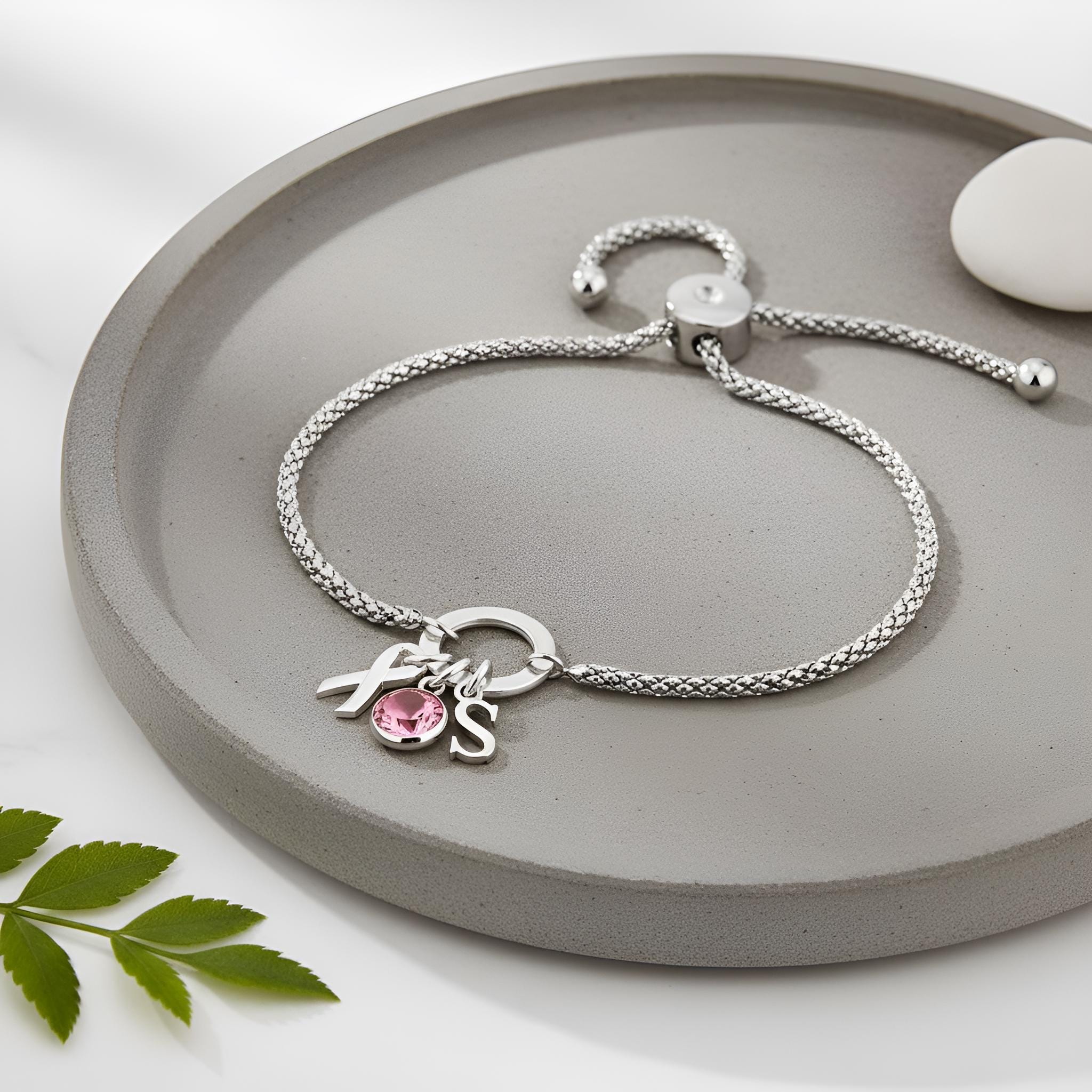 🎀 Celebrate the strength and bravery of the women you love with this Breast Cancer Survivor Bracelet. Handcrafted with care, it features a 925 sterling silver initial charm, a pink ribbon awareness charm, and a beautiful pink tourmaline birthstone.