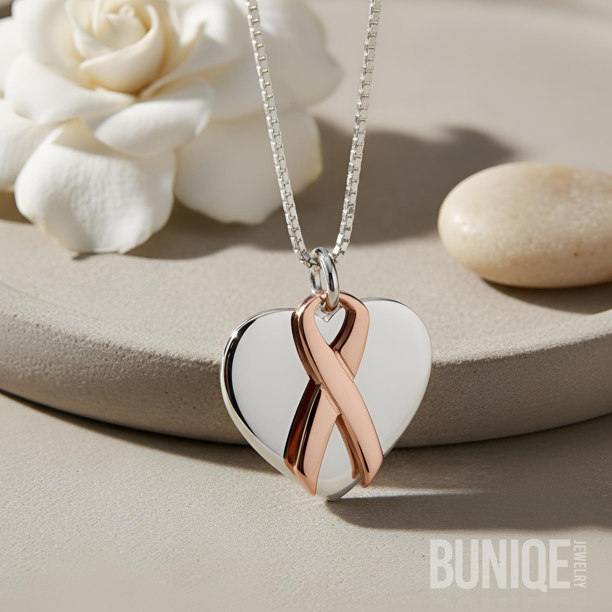 This elegant piece features a heart-shaped pendant paired with a delicate pink ribbon charm crafted from 925 Sterling Silver, 24K Gold Plated, or Rose Gold.
