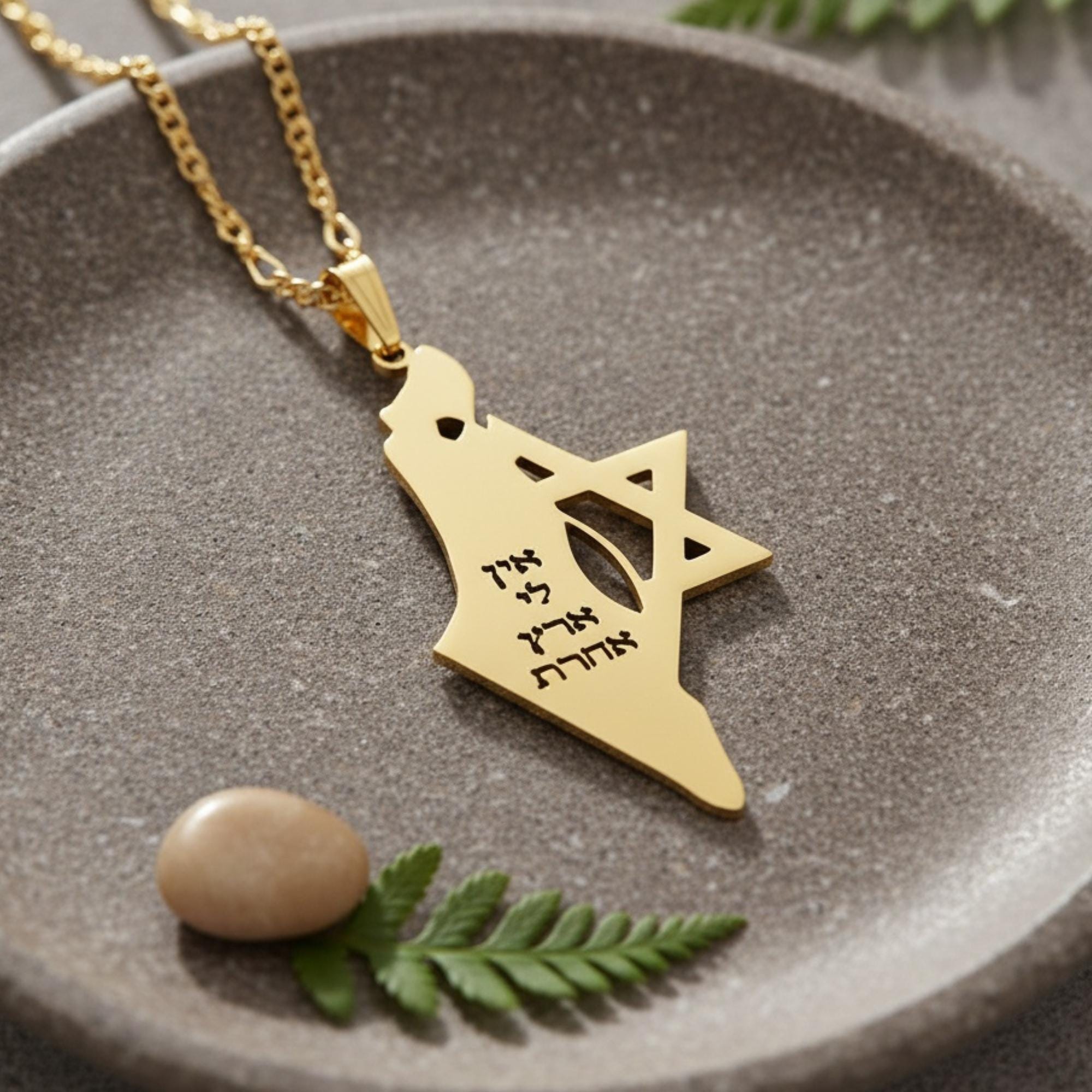 The Map of Israel pendant showcases intricate details, including a Magen David cutout inside the map shape, symbolizing cultural heritage and timeless style.