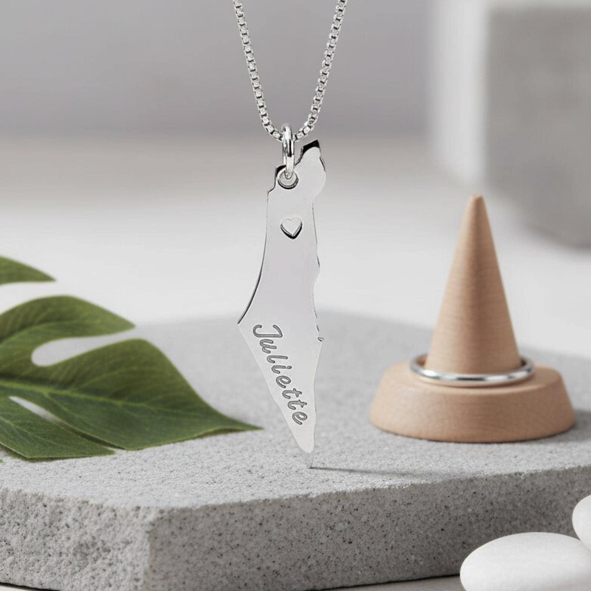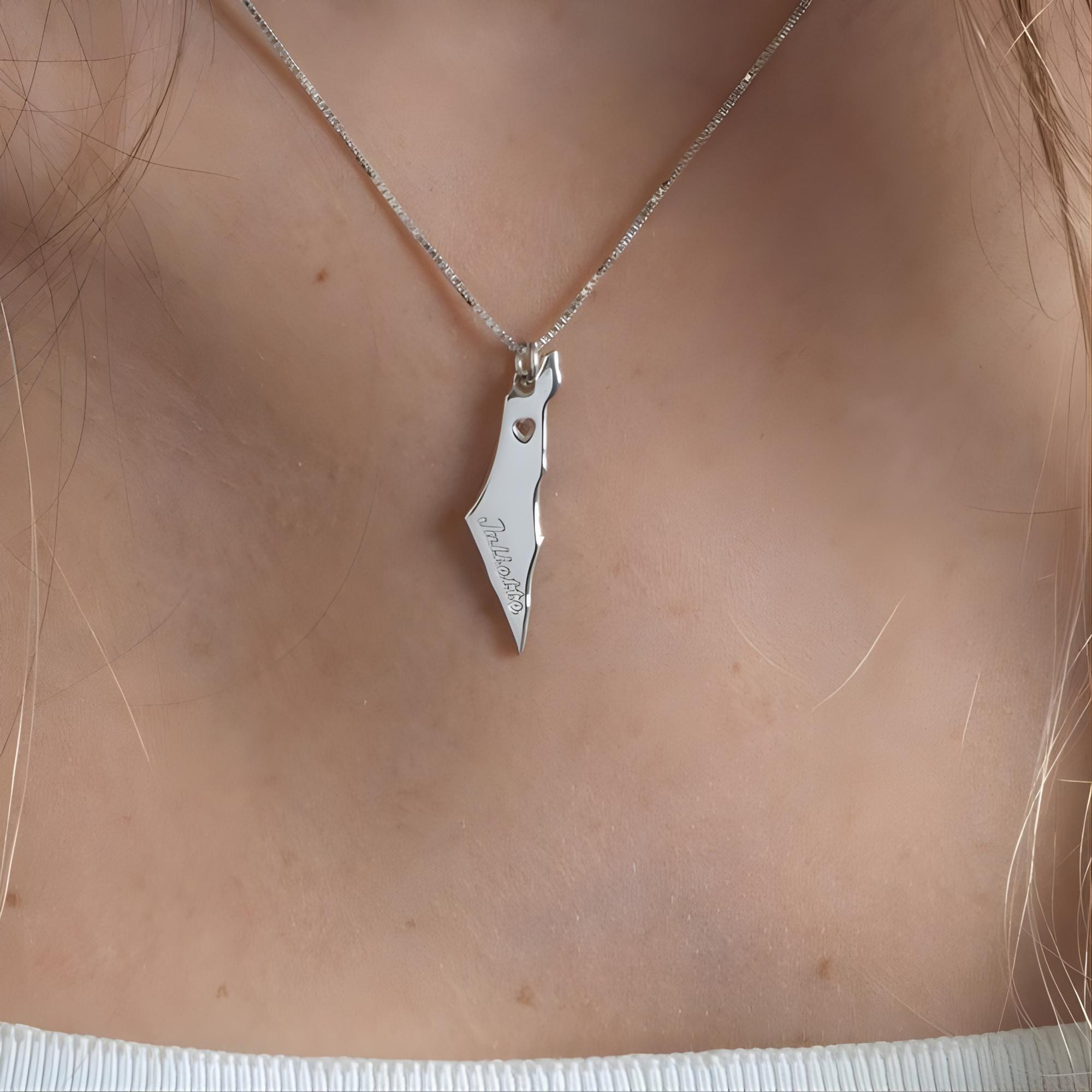 Add cultural meaning and timeless elegance to your jewelry collection with this Sterling Silver Israel Map Necklace, featuring a cutout heart and a personalized Hebrew name engraved vertically along the map.