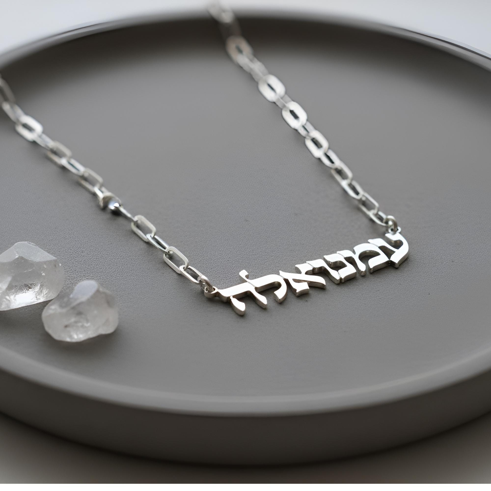 Crafted from 925 Sterling Silver, 24K Gold Plated, or Rose Gold, this elegant name pendant is designed in Hebrew letters and gracefully hangs from a silver paperclip chain.