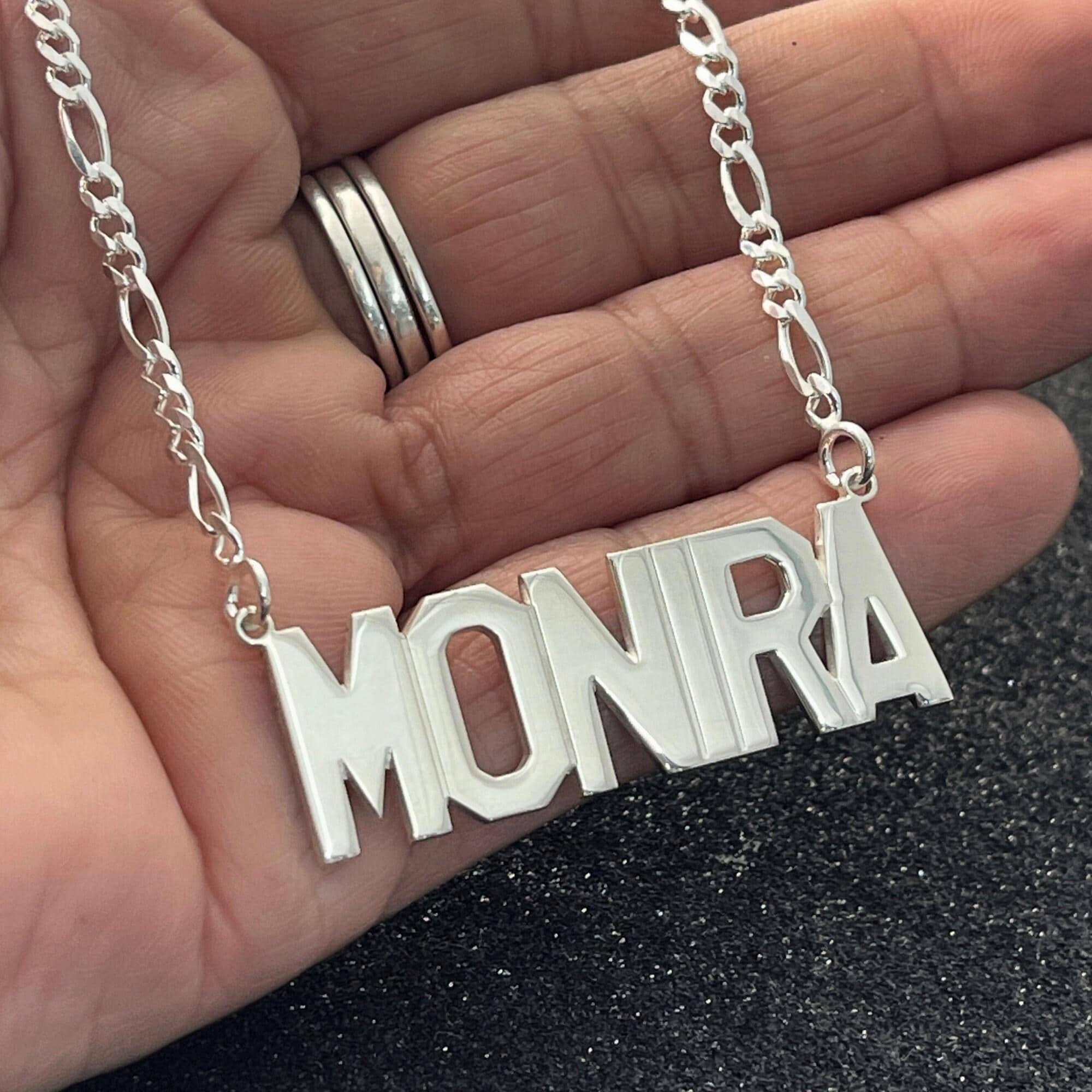 🔹Make a bold statement with this personalized large name necklace! Crafted from 925 solid sterling silver with a sturdy 3mm Figaro chain, this stunning necklace is the perfect way to showcase his unique style.