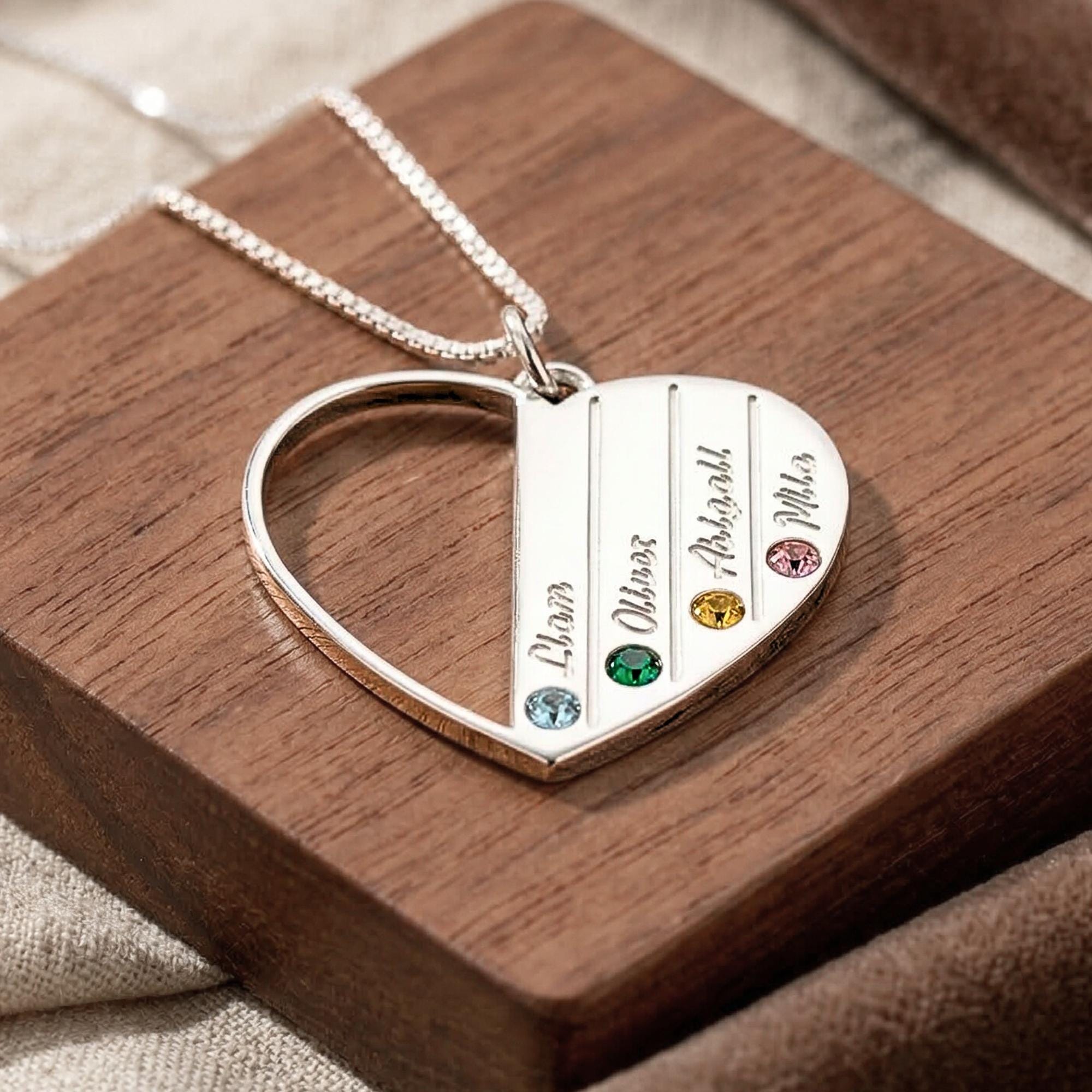 Each heart pendant can be engraved with children’s names and adorned with matching birthstones, creating a meaningful keepsake she will cherish forever.