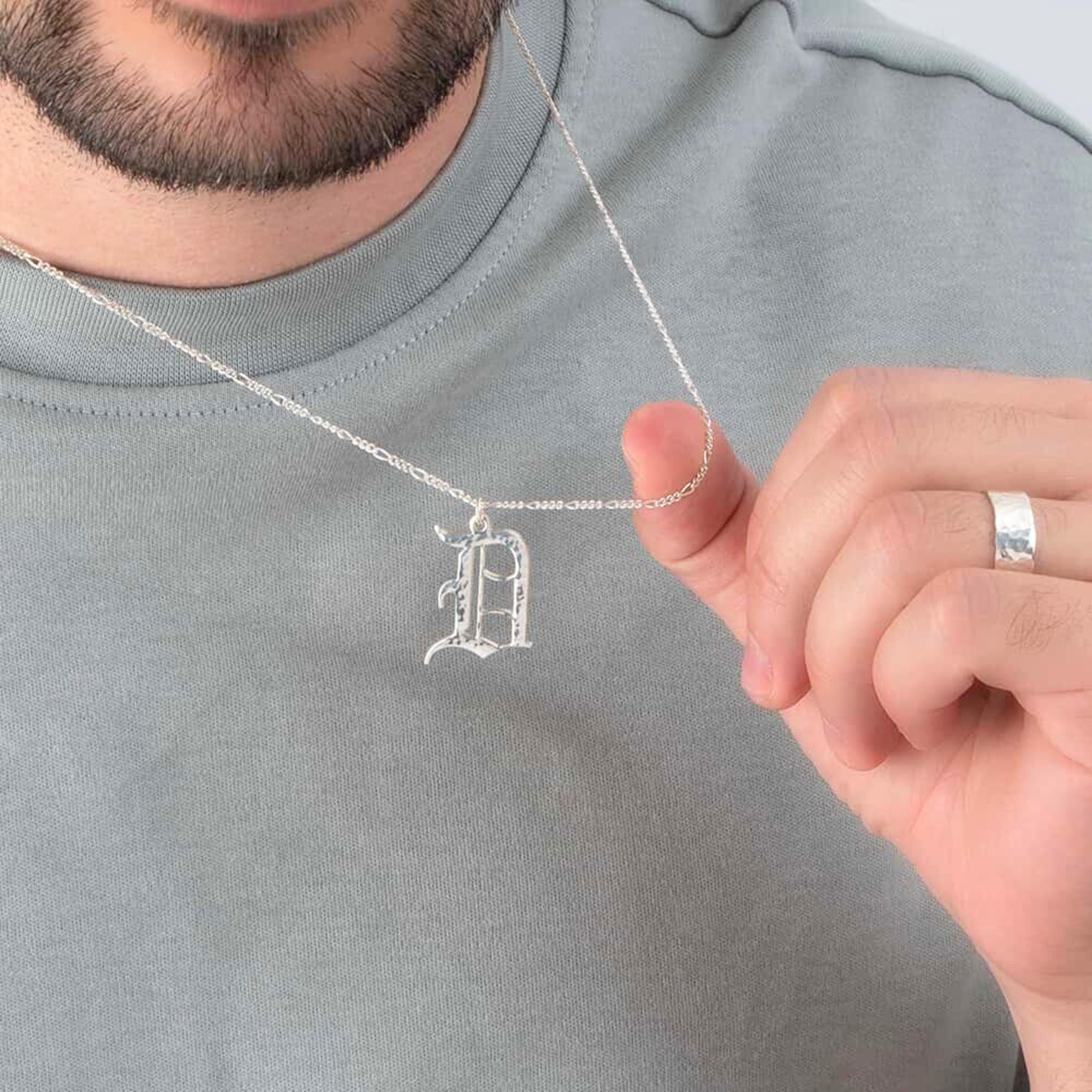 💎 This Hammered Old English Initial Necklace is a bold and timeless piece of handmade jewelry. Featuring a large letter pendant in Gothic font paired with a 2mm Figaro chain, this 925 silver necklace adds a personalized touch to any look. Handcrafted from 925 solid silver or available in 24K gold plating, it makes a thoughtful Christmas gift idea or a meaningful, personalized gift for men and women.