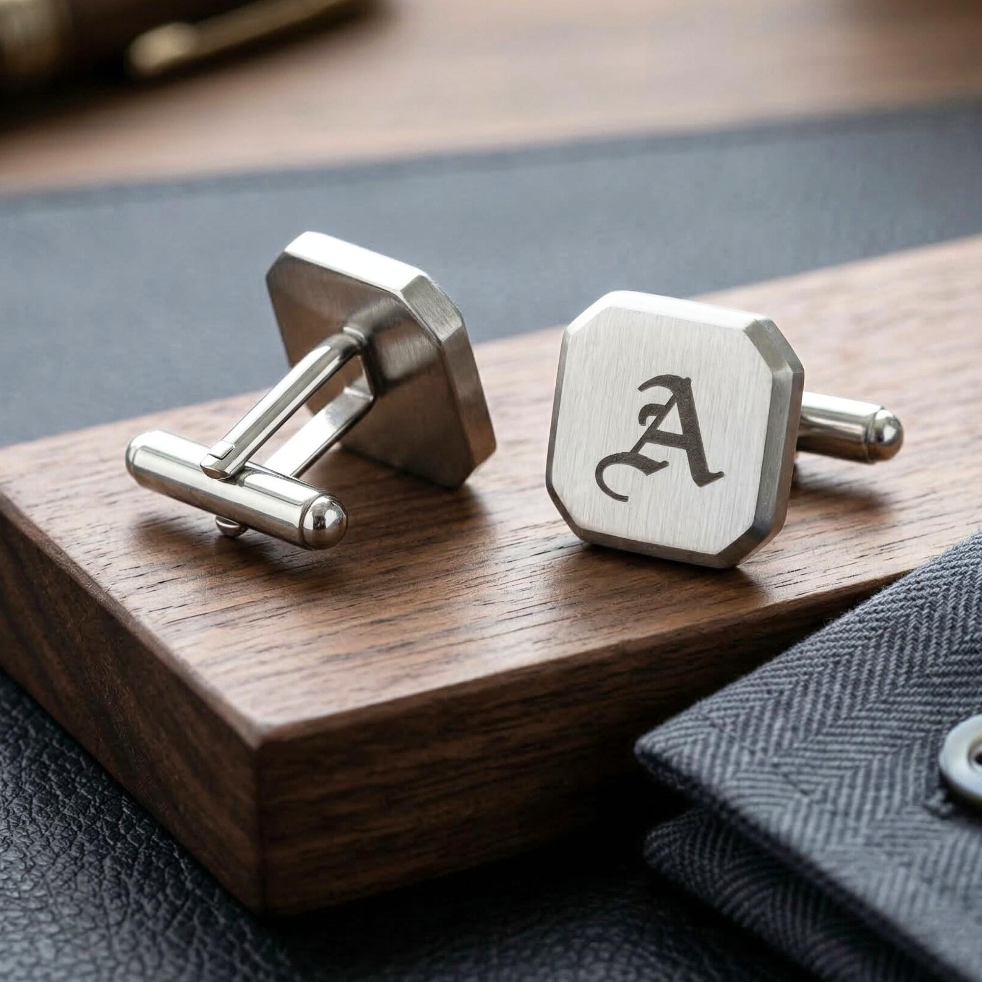 This custom-engraved square cufflink set is crafted from high-quality stainless steel and can be personalized with names, initials, or a particular date.