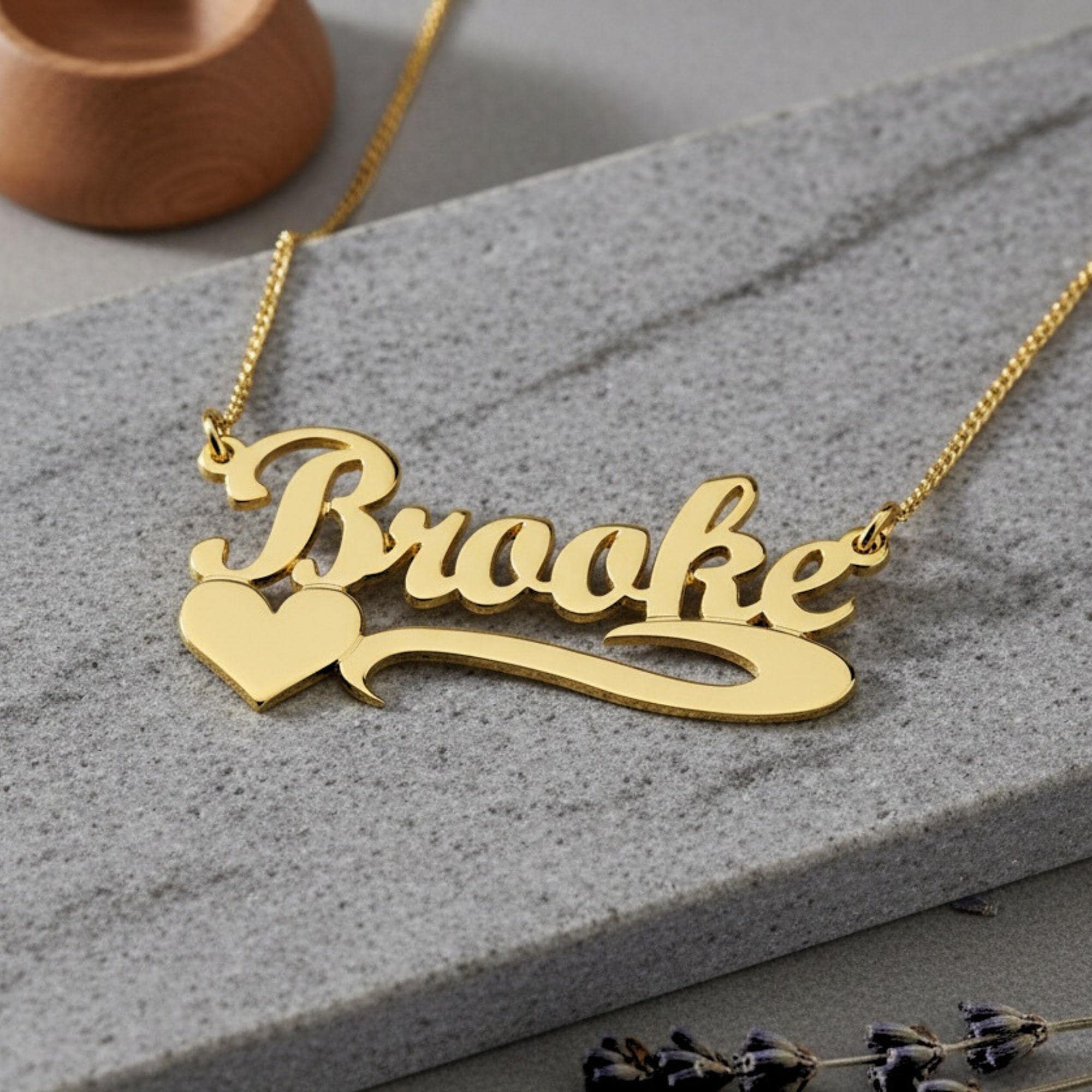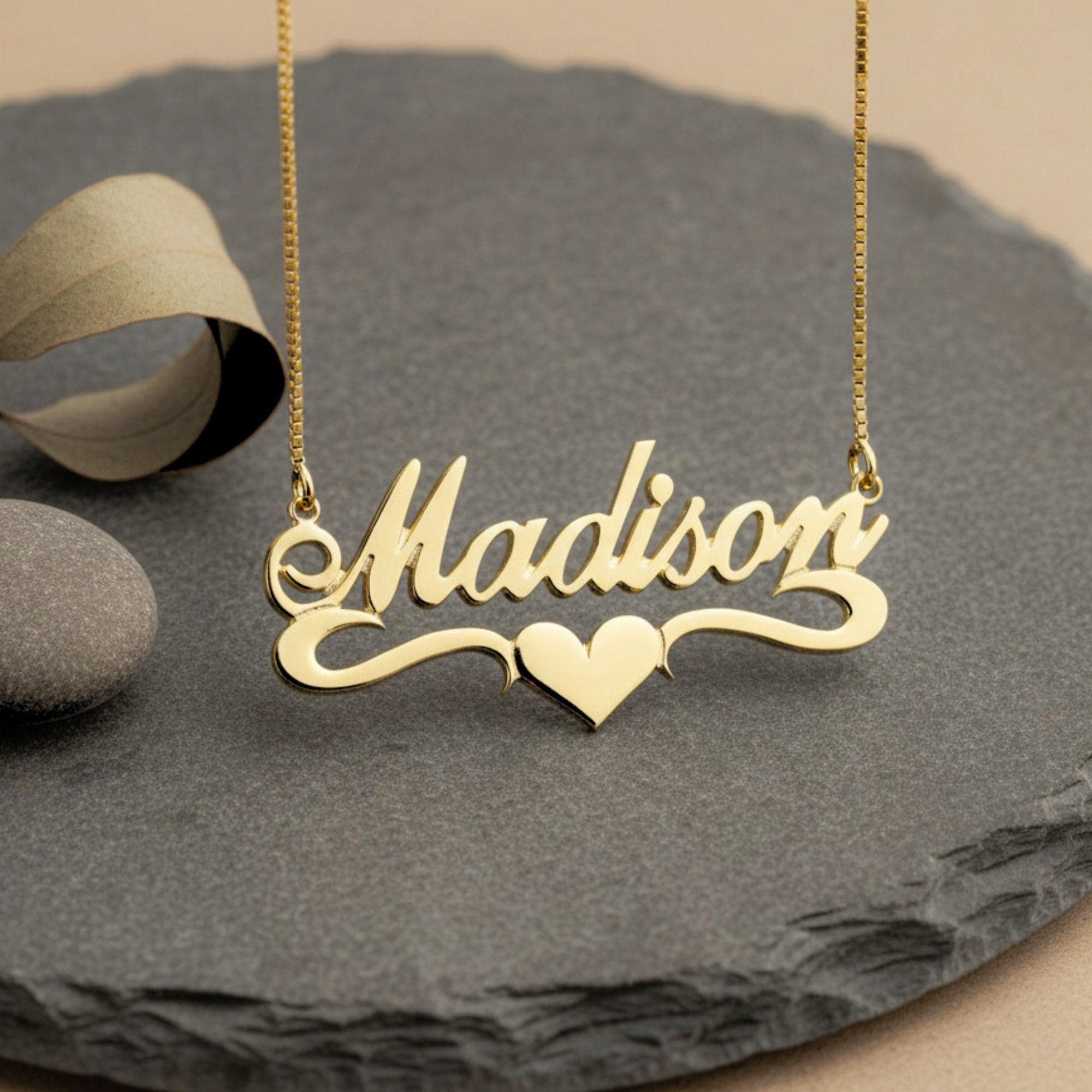 This stunning 14K Gold Heart Name Necklace is crafted from solid 14K gold and features a personalized nameplate with a charming heart pendant.